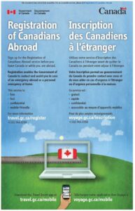 Before you leave Canada, you can register your trip with the Government of Canada through the Registration of Canadians Abroad (ROCA).