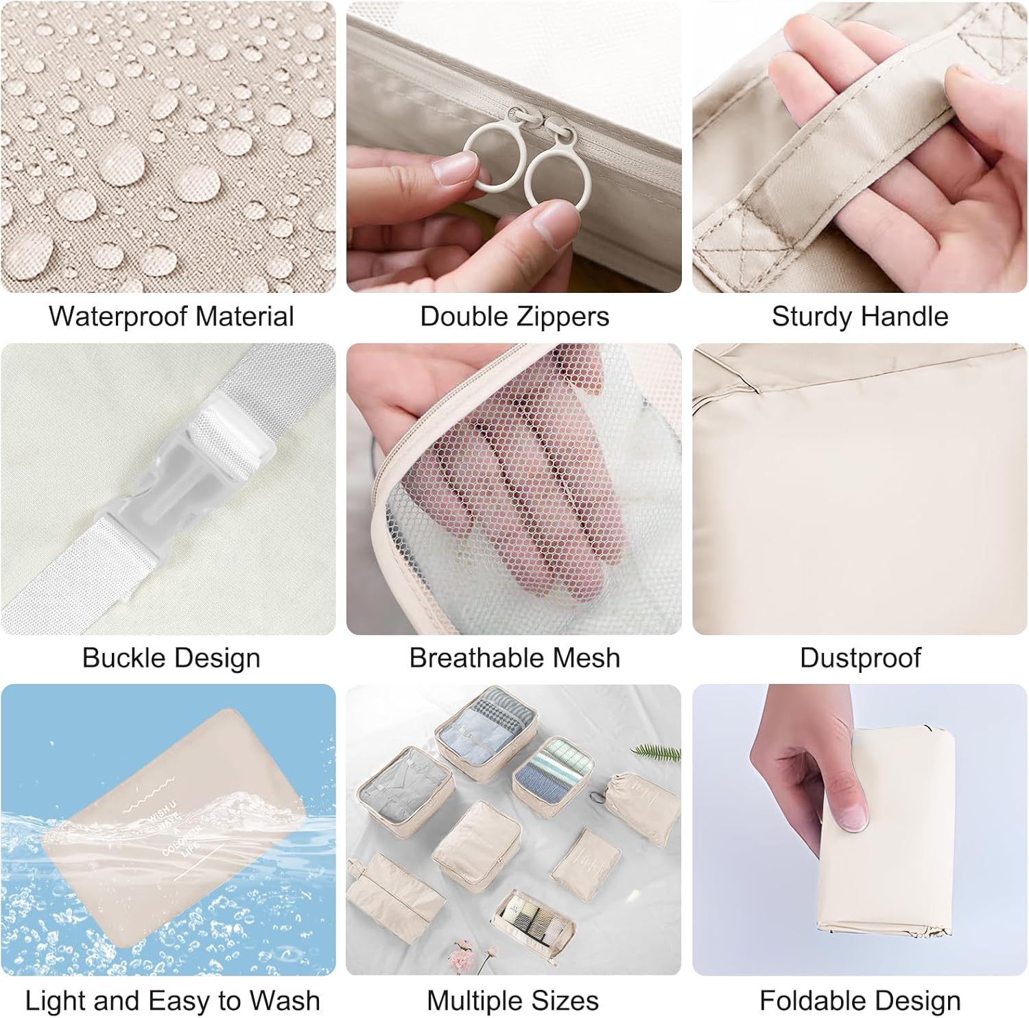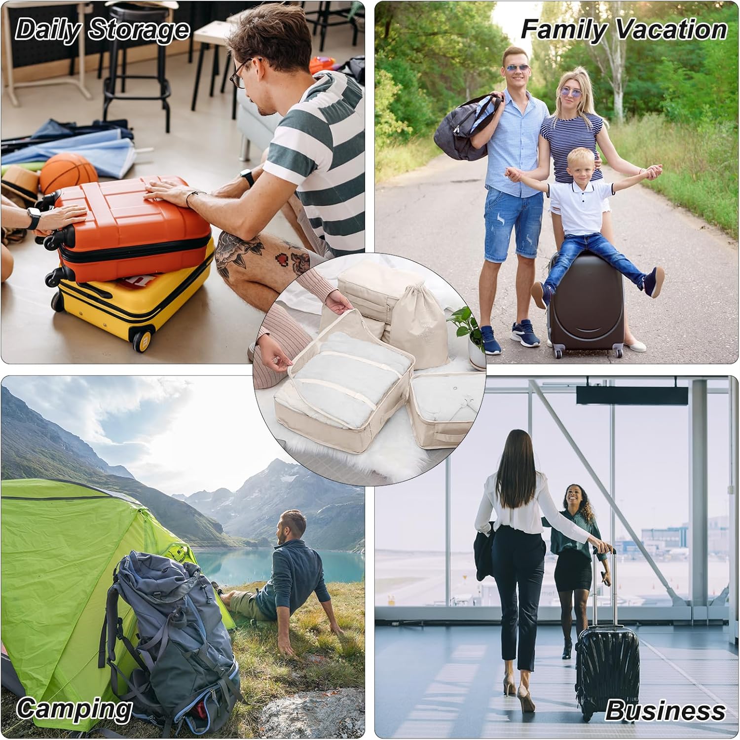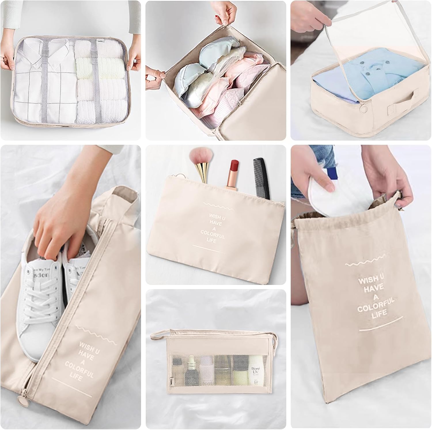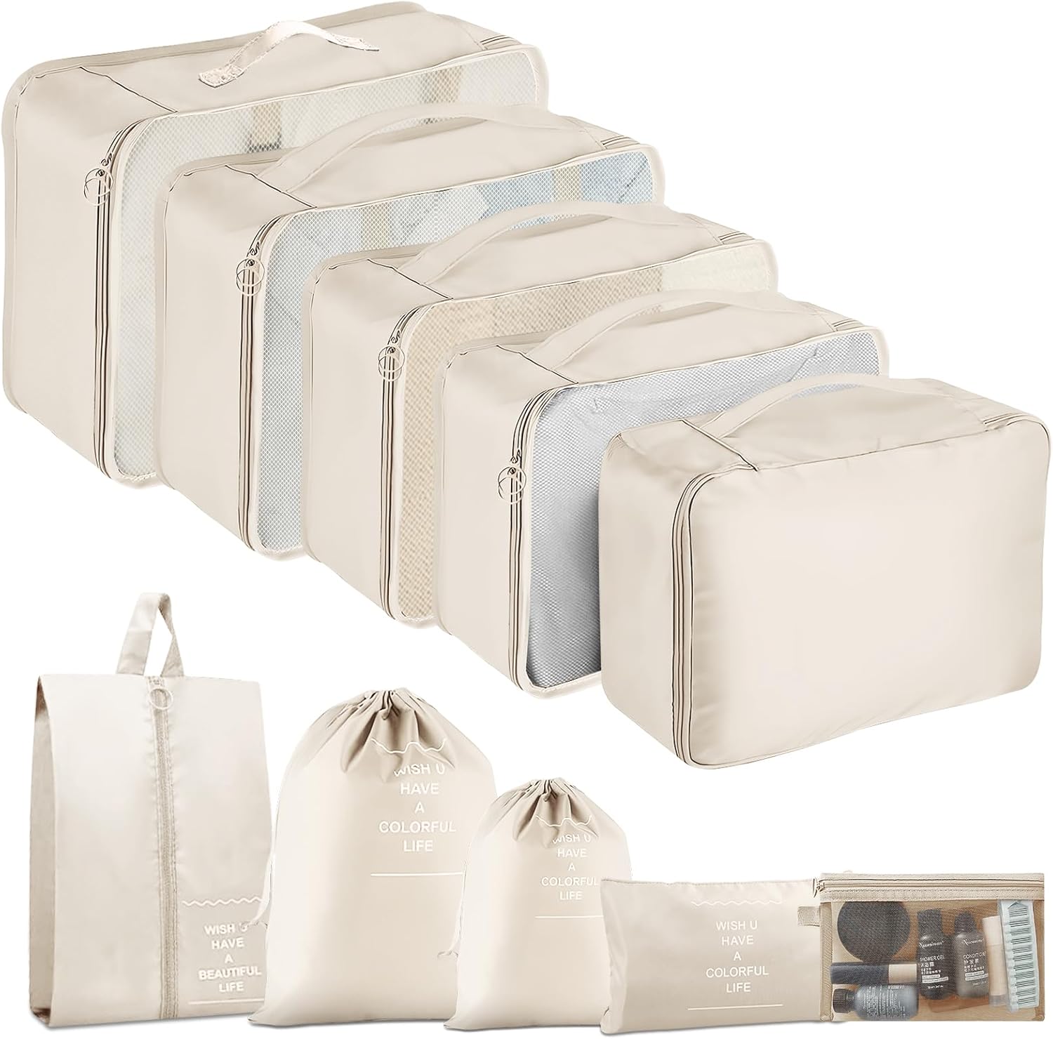 Travel Packing Cubes: Our 10 set travel packing cubes include 1 laundry bags, 4 mesh breathable packing cubes (1 Xlarge, 1 large, 2 medium) 1 underwear packing cube along with a cosmetic bag, a shoe bag, a accessory bag and a flat bag. for essentials like jackets, shirts, trousers, underwear, toiletries, and more.