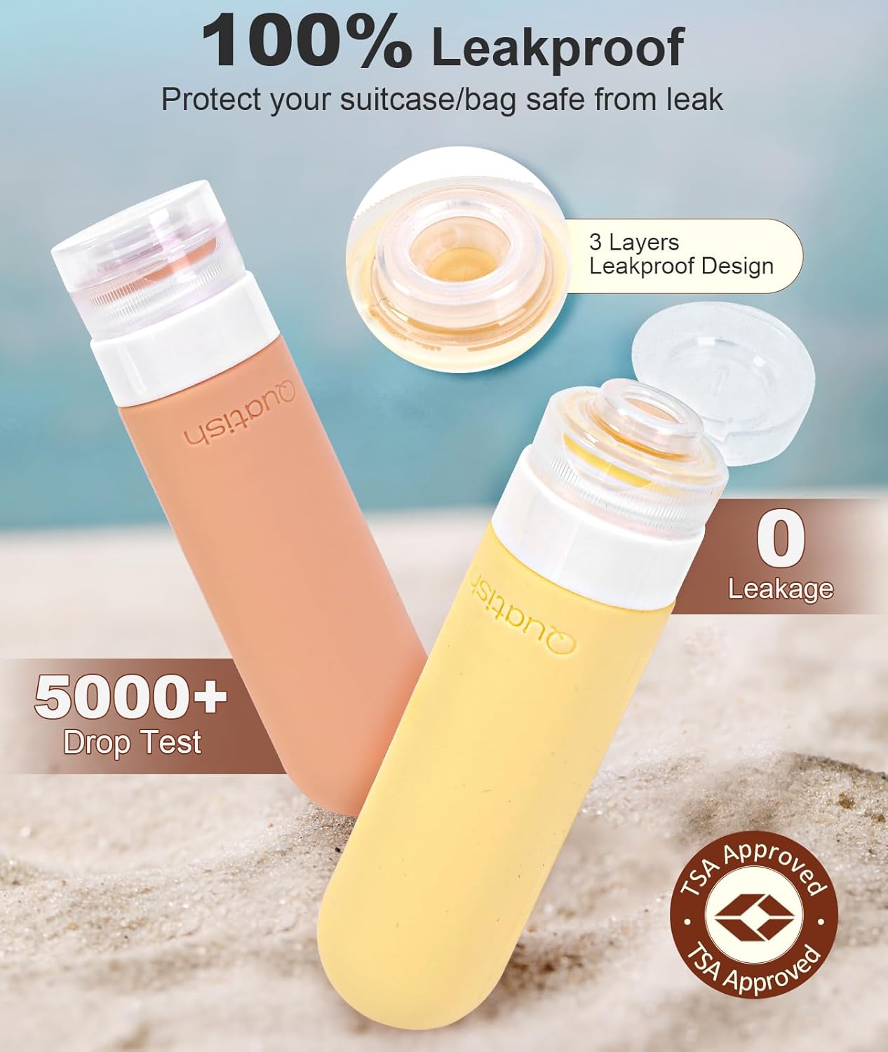 100% Leakproof TSA Approved: Silicone bottles have a 3-layer lid design, firm seals. With durable toiletry bag, keeping the liquids securely inside the container to prevent leak, protect your luggage