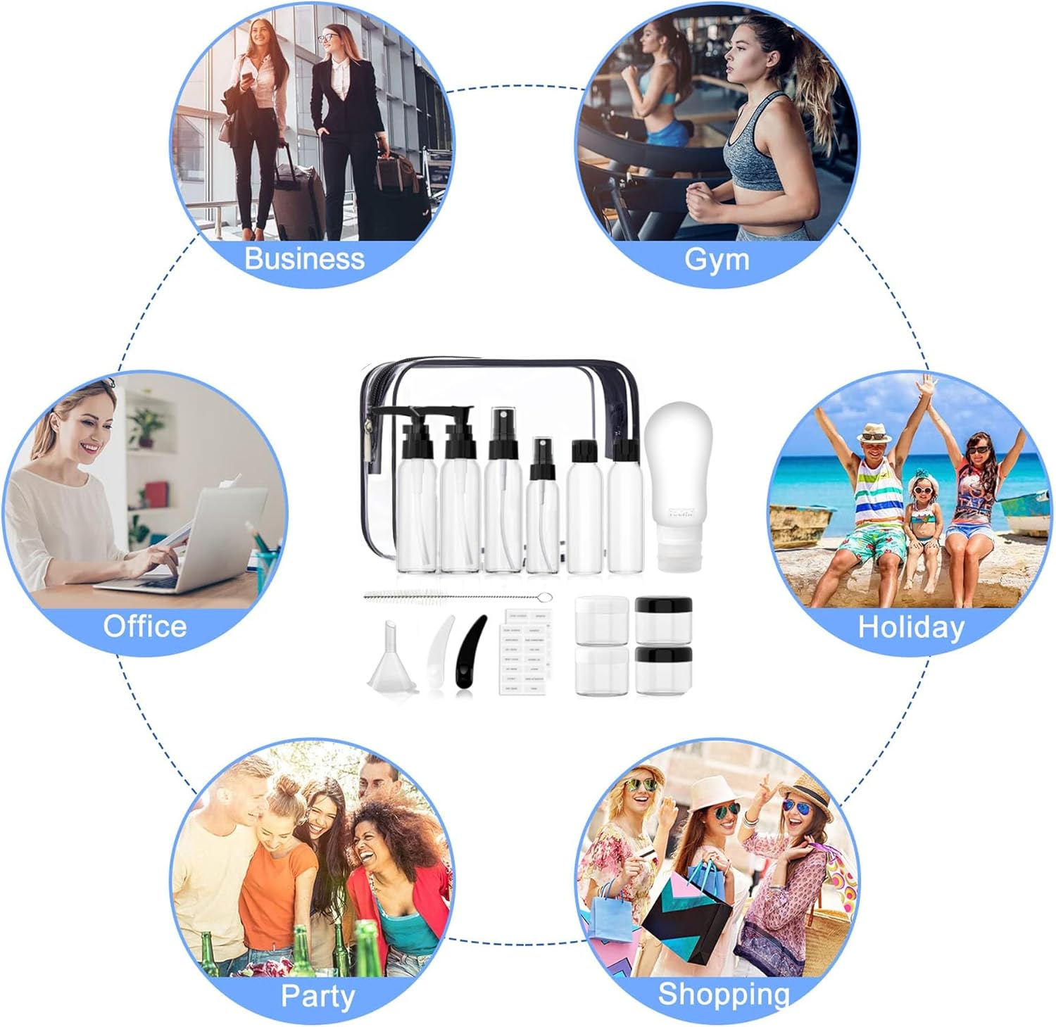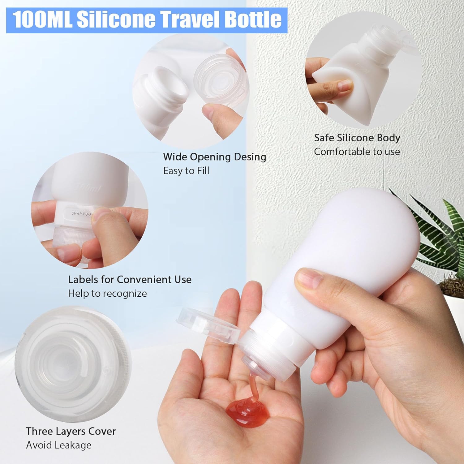 ✈️Reusable Travel Bottles Set – This toiletry travel kit comes with a 100ml silicone bottles, four jars, two spray bottles, two pump bottles, two flip bottles, two scoopers, a funnel, a clean brush, two labels, and a clear toiletry bag.This 18-pack travel bottles set lets you bring along every last product you want and help you get more organized.