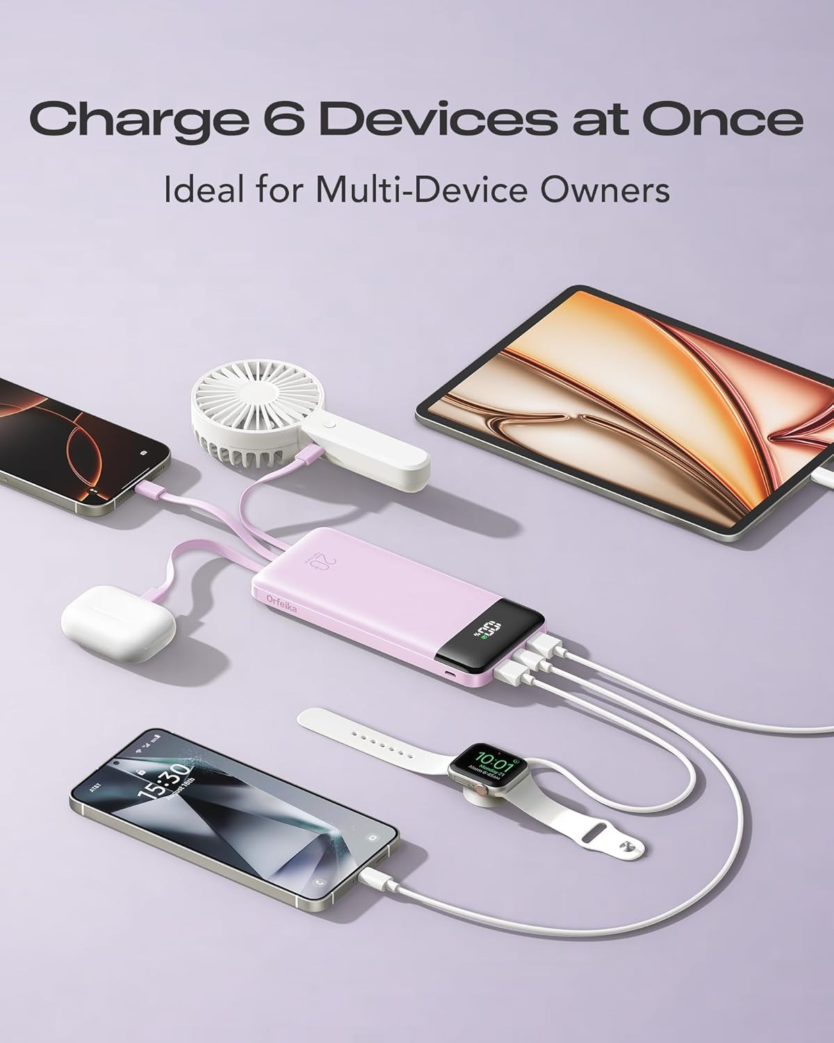 🔋【6 Outputs, 4 Inputs】 Battery pack may charge 6 devices at once, recharge itself with 4 options. If you are a heavy user of electronics, or have multiple phones or tablets, then this powerbank is definitely your best choice. With its built-in cables, it eliminates the hassle of carrying a bunch of chargers and cables, making it the most powerful essential for you. It ensures that you always have enough power on the go, allowing you to charge all your devices simultaneously