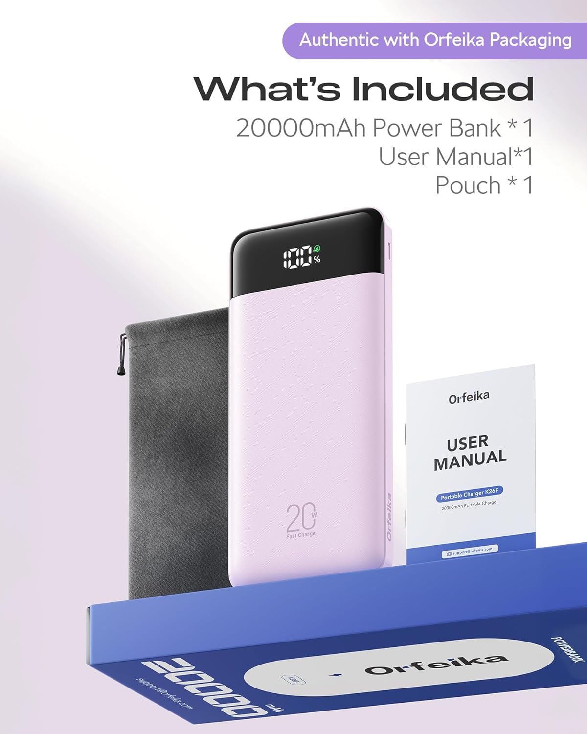 🔋【Universal Compatibility & Sufficient Capacity】Orfeika power bank is widely compatible with all brands phones, tablets. 20000mAh capacity is enough to power devices for several days. It charges iPhone 14 about 3.8 times, Samsung Galaxy S23 Ultra 2.5 times, Google Pixel 7 about 2.7 times. Its high capacity and efficient charging technology provide a reliable and fast charging experience. Say goodbye to the inconvenience of running out of battery and embrace this powerful 20000 power bankk K26F Lilac