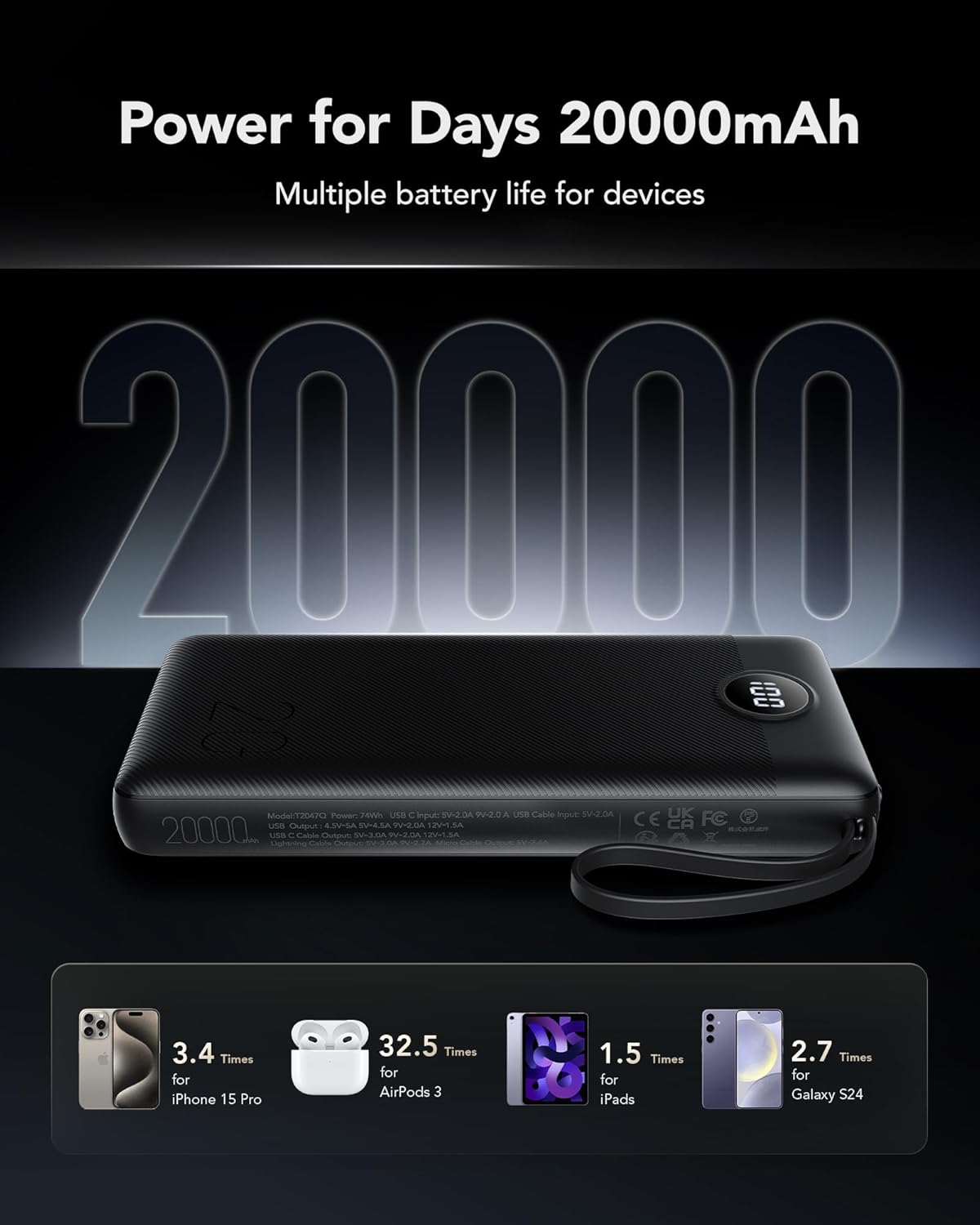 [Portable Charger with Built-in Cables] This 20000 mAh portable charger battery has a built-in Micro cable, Type C cable, and another cable for iPhone, total of three durable output cables. It’s convenient to charge for all smart devices directly. Also, the USB C portable charger has a built-in USB cable for recharge the power bank itself directly. Wherever you go, don’t need to carry any extra cords.