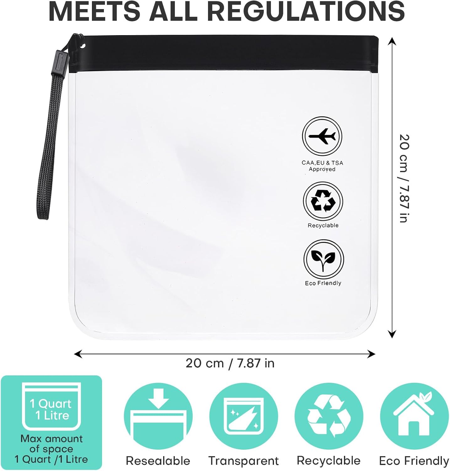 š±ćWorld Travel & TSA Approvedć: This 7.87*7.87 inch clear travel toiletry bag can easily and quickly pass through airport in US and EU&UK.It strictly follows TSA 3-1-1 regulations. This toiletry travel bag is clear and perfectly sized so you can get through security quickly without getting hassled by TSA officers, allowing you to travel the world more conveniently. Maximum liquids 1 quart/liter bag.