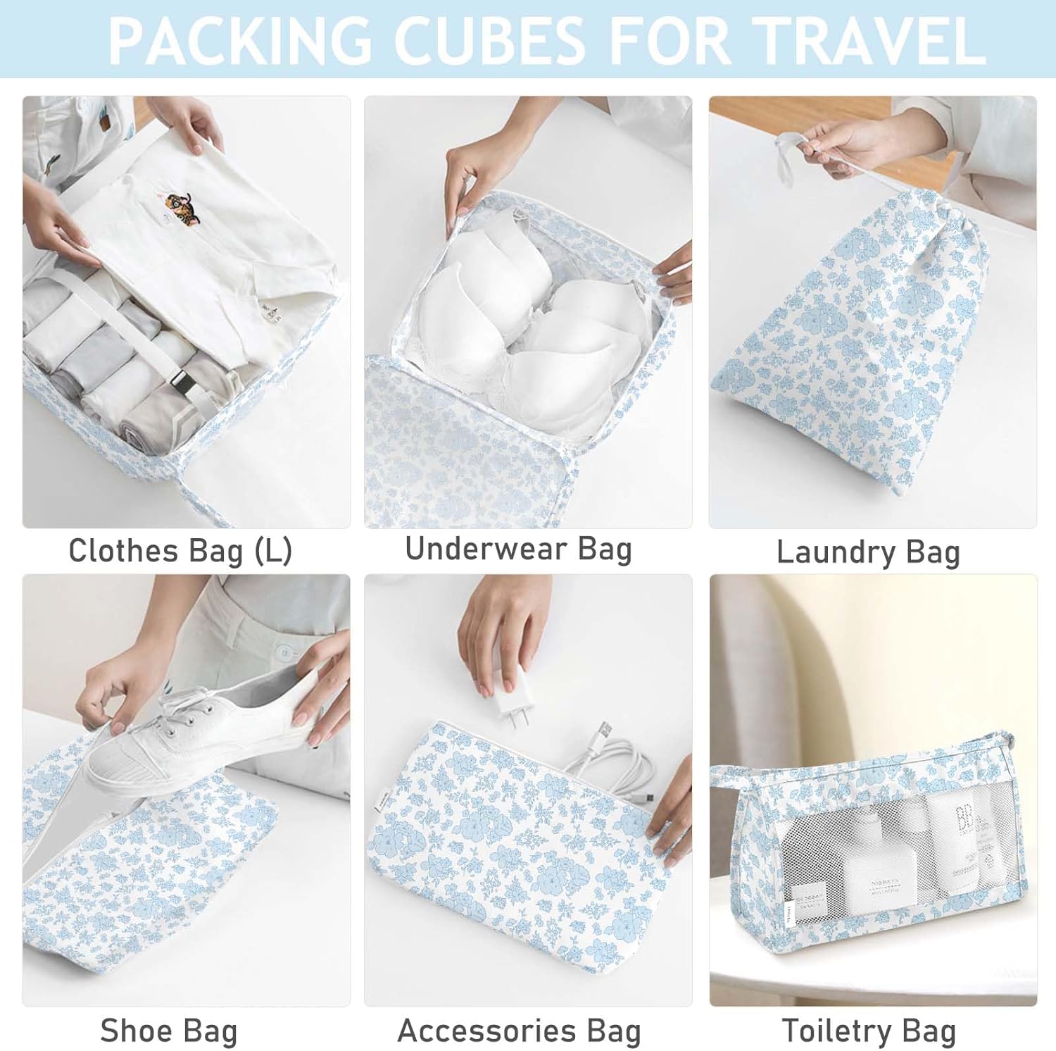 8PC Complete Set】 3 X different size Packing Cubes, 1 X Bra Underwear bag , 1 X Shoes Bag , 1 X Toiletry Bag ,1 X Laundry Bag ,1 X Cable Bag. Multiple travel bags organizer meet many lifestyles including traveling, backpacking, camping, gym.