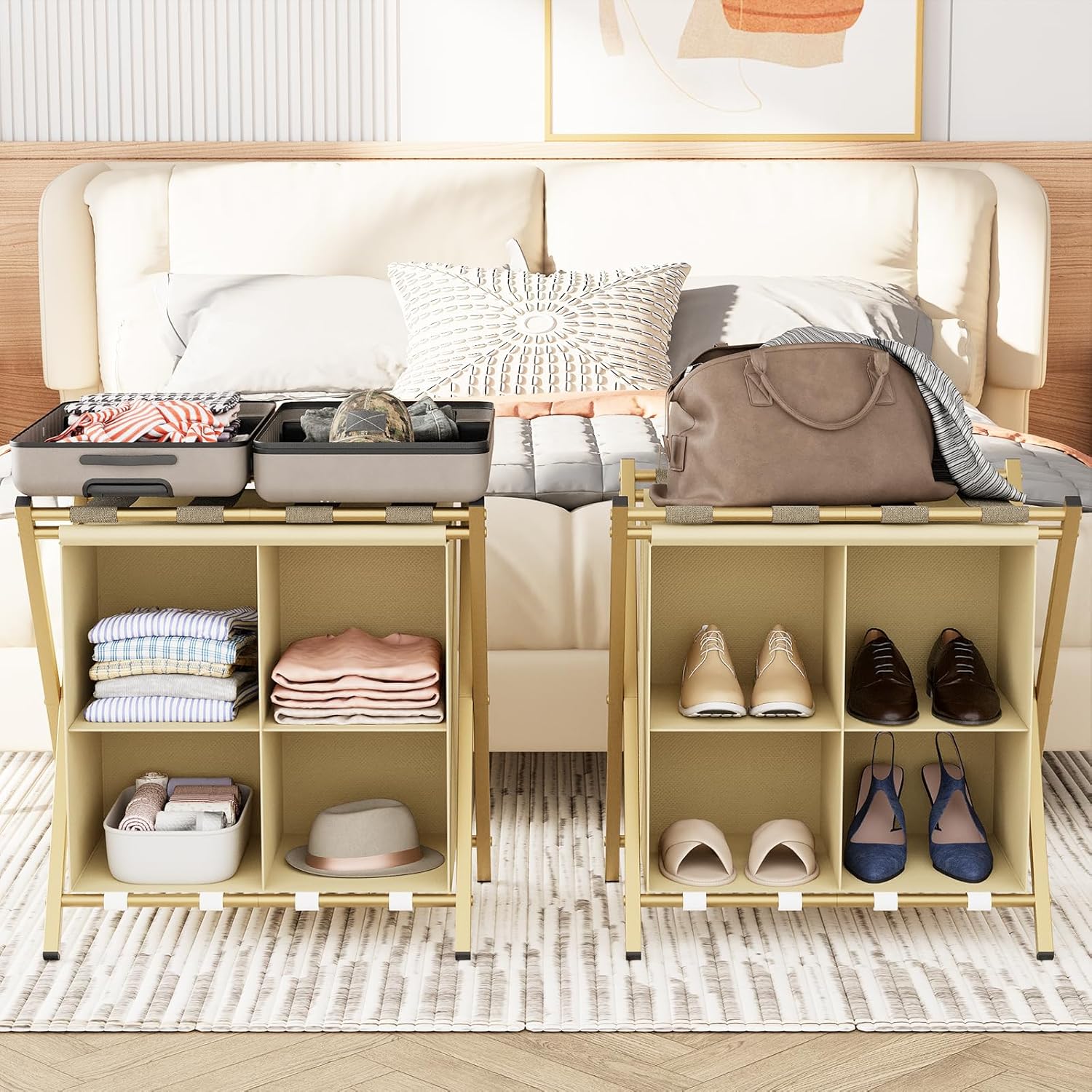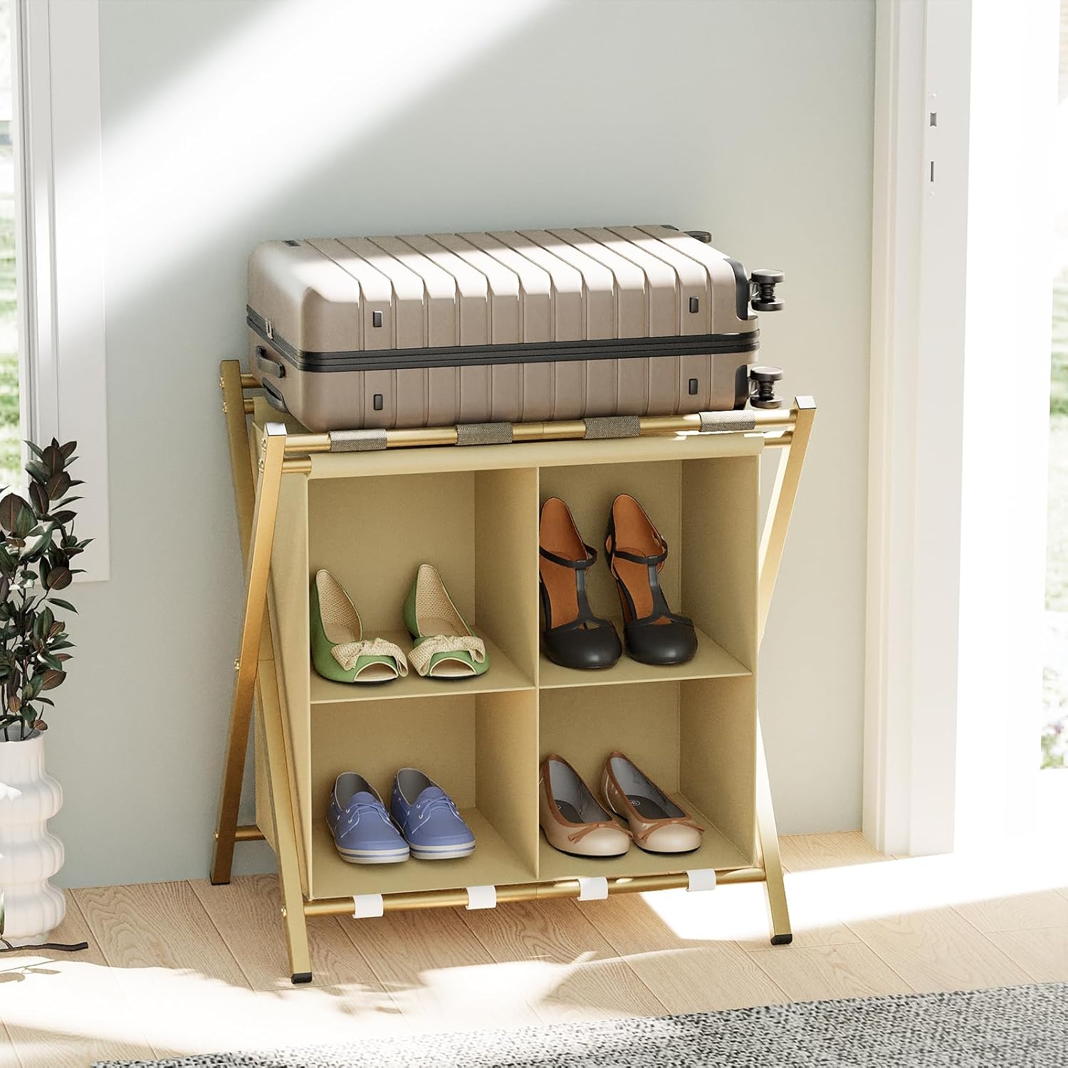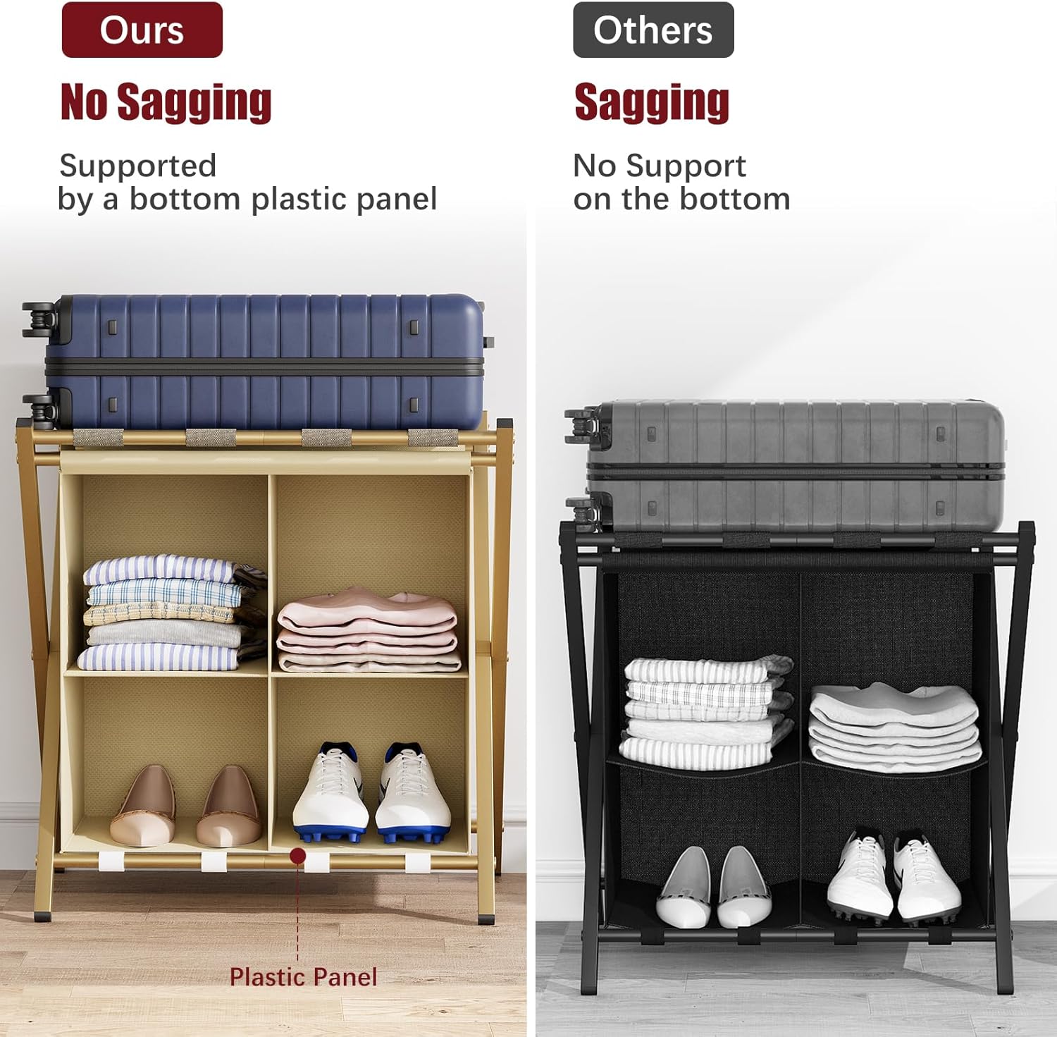 – The luggage rack is designed with 4 storage Spaces at the bottom, which can be used to store clothes, shoes, slippers, towels, etc.