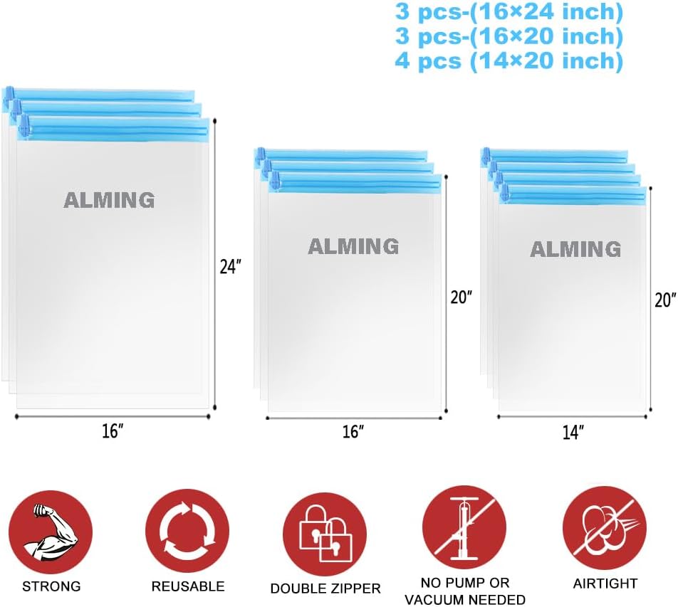 Use ALMING vacuum compression bag to easily solve all kinds of troubles. Large capacity storage can save 75% space, maximize suitcase, wardrobe space.