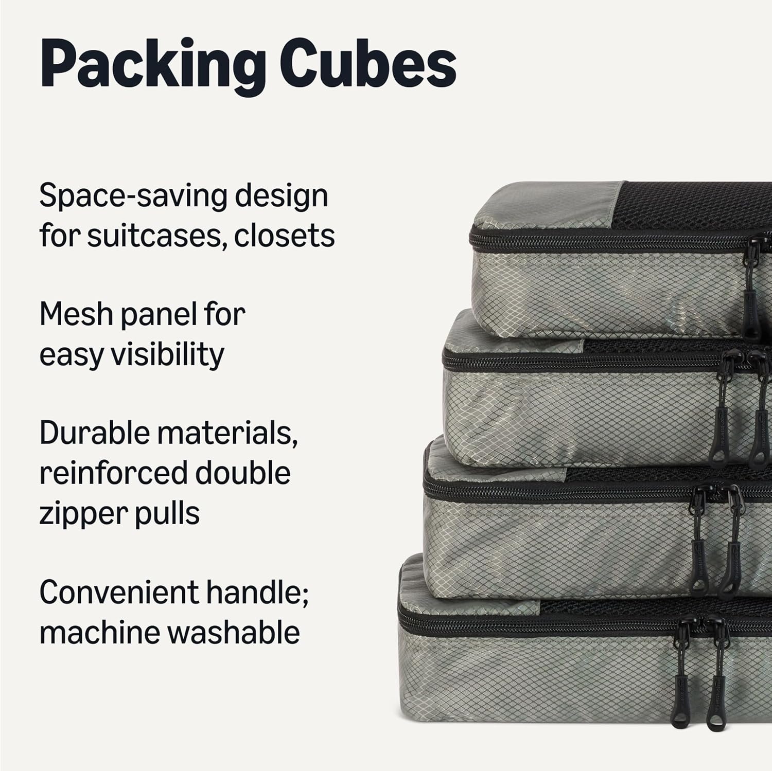 Amazon Essentials set of 4 slim packing cubes with mesh tops for visibility. Made of 100% polyester with double zips, designed to organise clothes and accessories in luggage.