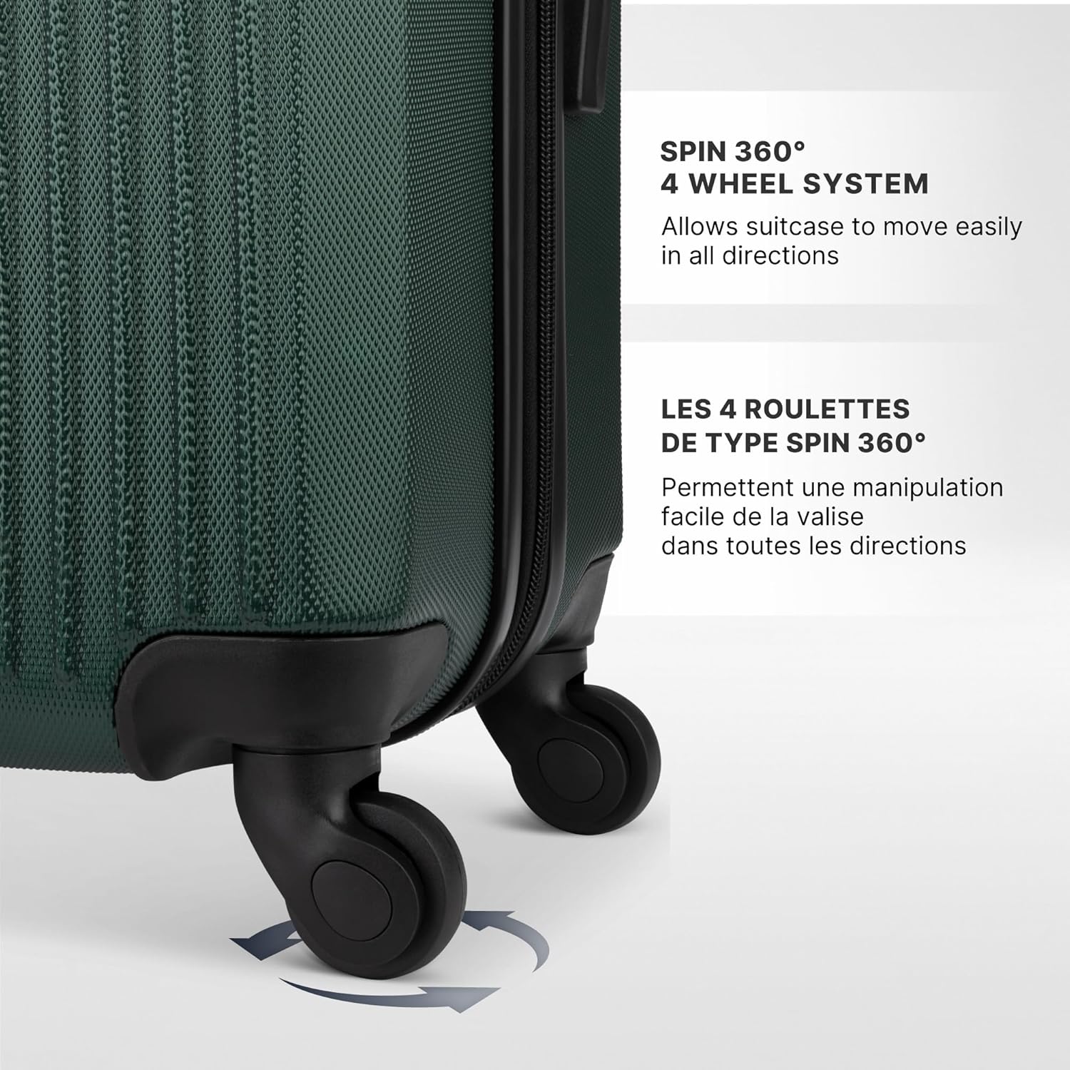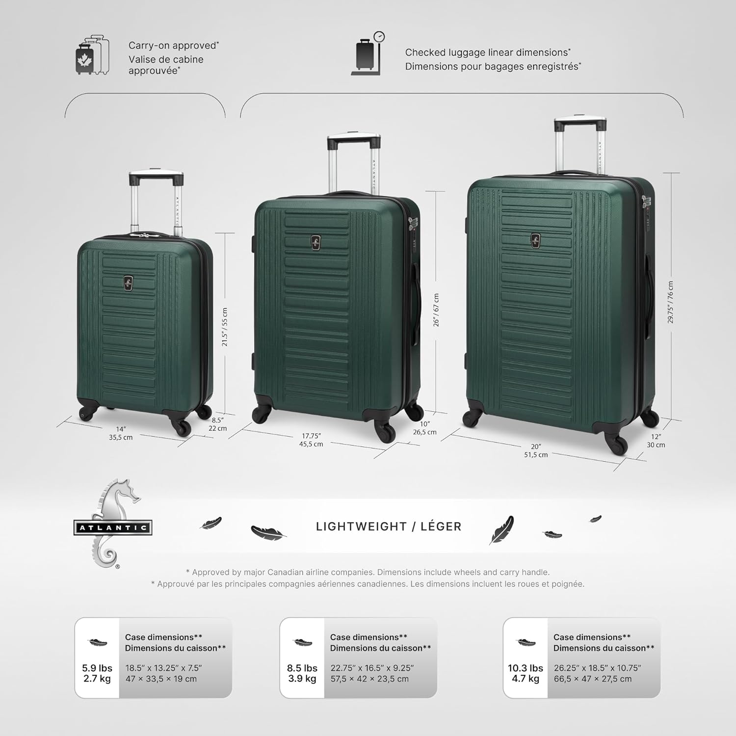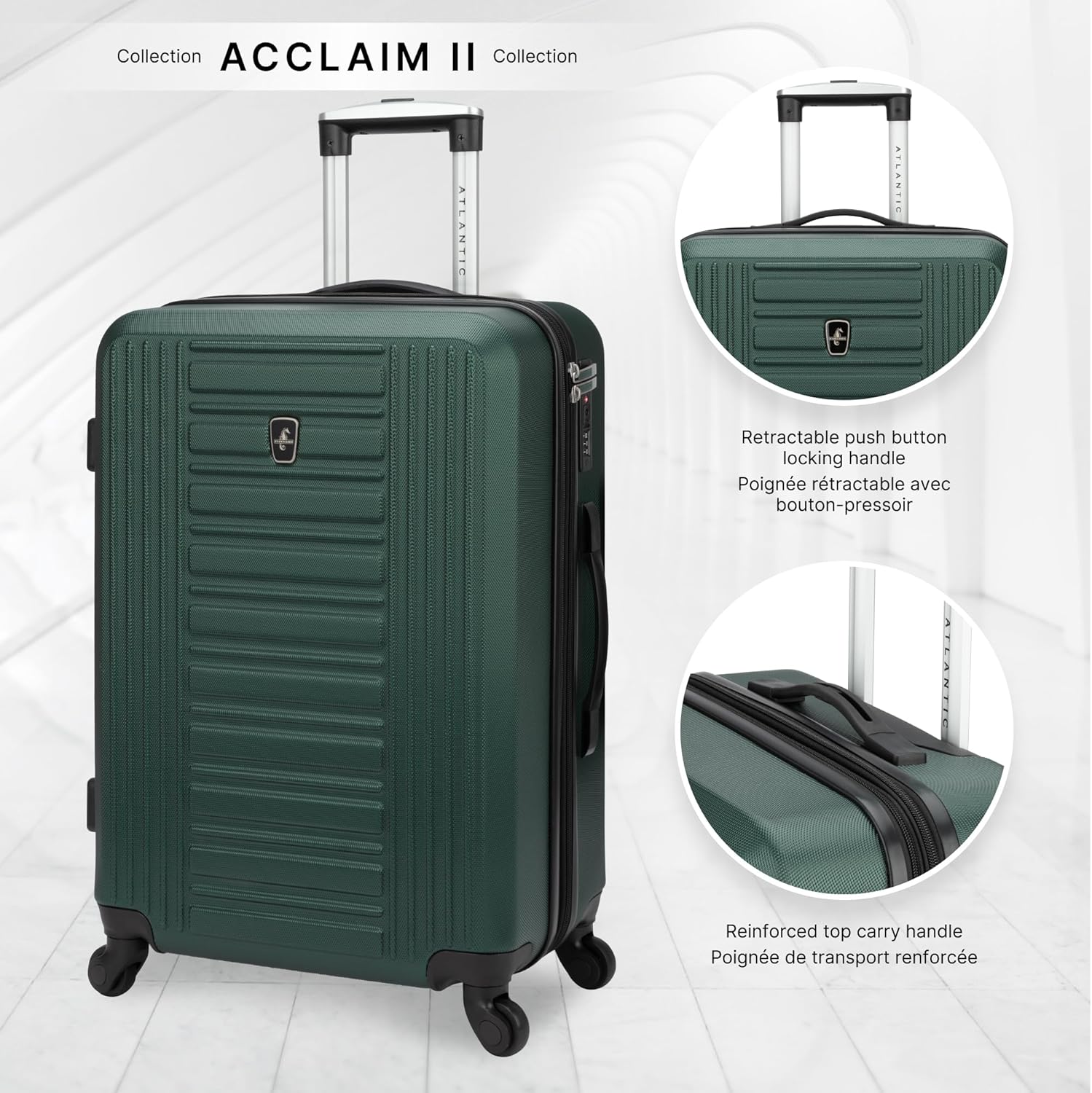 Embrace durability and reliability with the ATLANTIC Acclaim II Hardside Large Checked Luggage in silver, black, and bottle green. Crafted from extra-thick scratch-resistant ABS, it guarantees weather resistance and long-lasting performance. High-tensile self-repairing zippers and reinforced top and bottom handles add to its sturdiness. The lightweight design expands packing capacity for your convenience. A split case design with a privacy pocket ensures organized stowing. Maneuver effortlessly with the retractable push-button locking handle and four 360-degree spinner wheels. Enjoy peace of mind with a 10-year limited warranty. Approved by major Canadian airlines, this luggage caters to your travel needs. Dimensions including wheels and handle: 29.9″ x 20.3″ x 12″ / 76 x 51.5 x 30 cm; case dimensions: 27″ x 19″ x 12″ / 68.5 x 48.25 x 30 cm; weight: 10.3 lbs / 4.7 kg. Embrace your wanderlust and go on adventures with confidence and style.