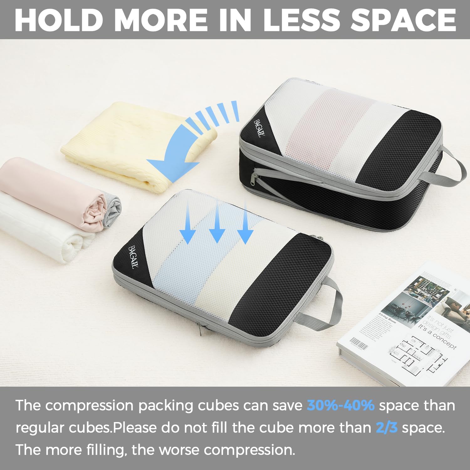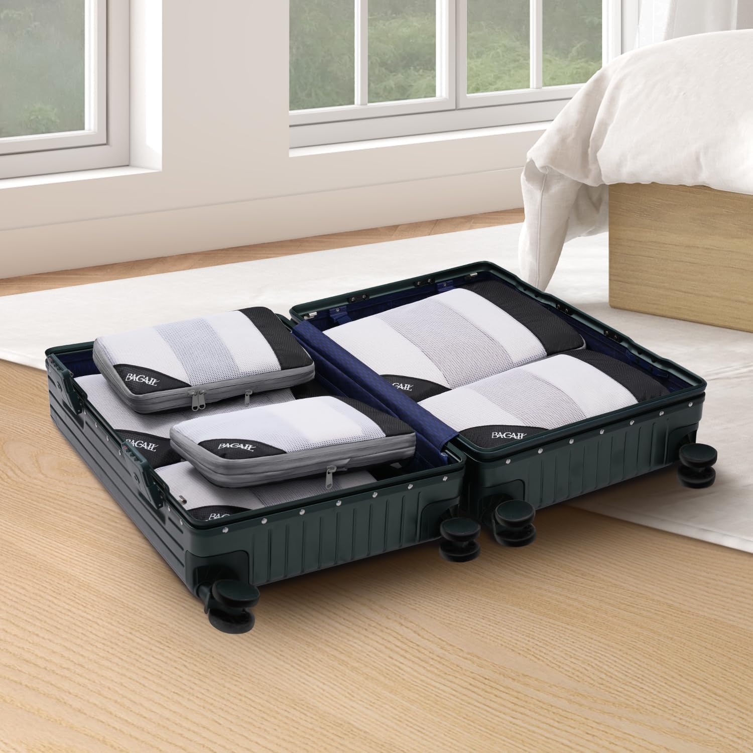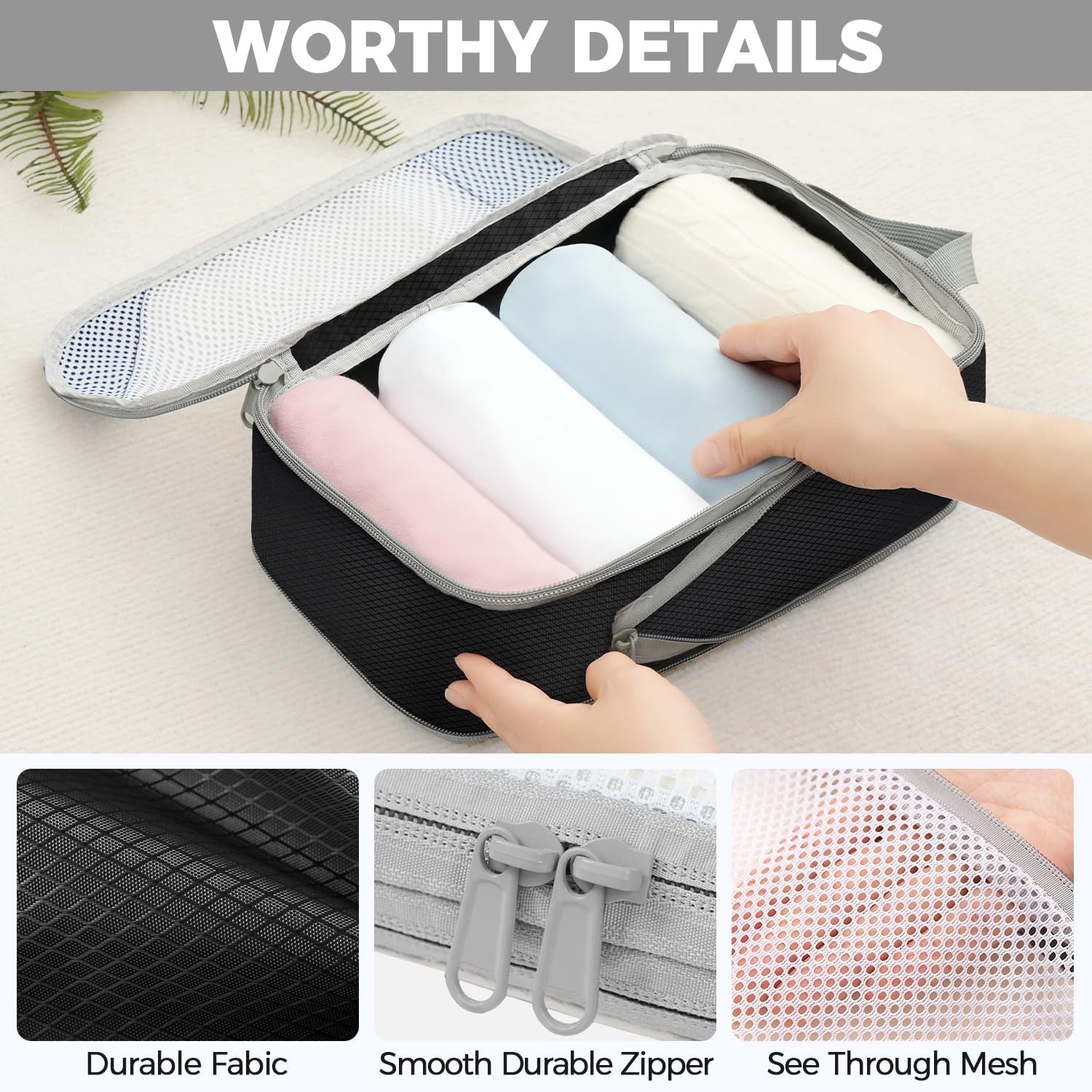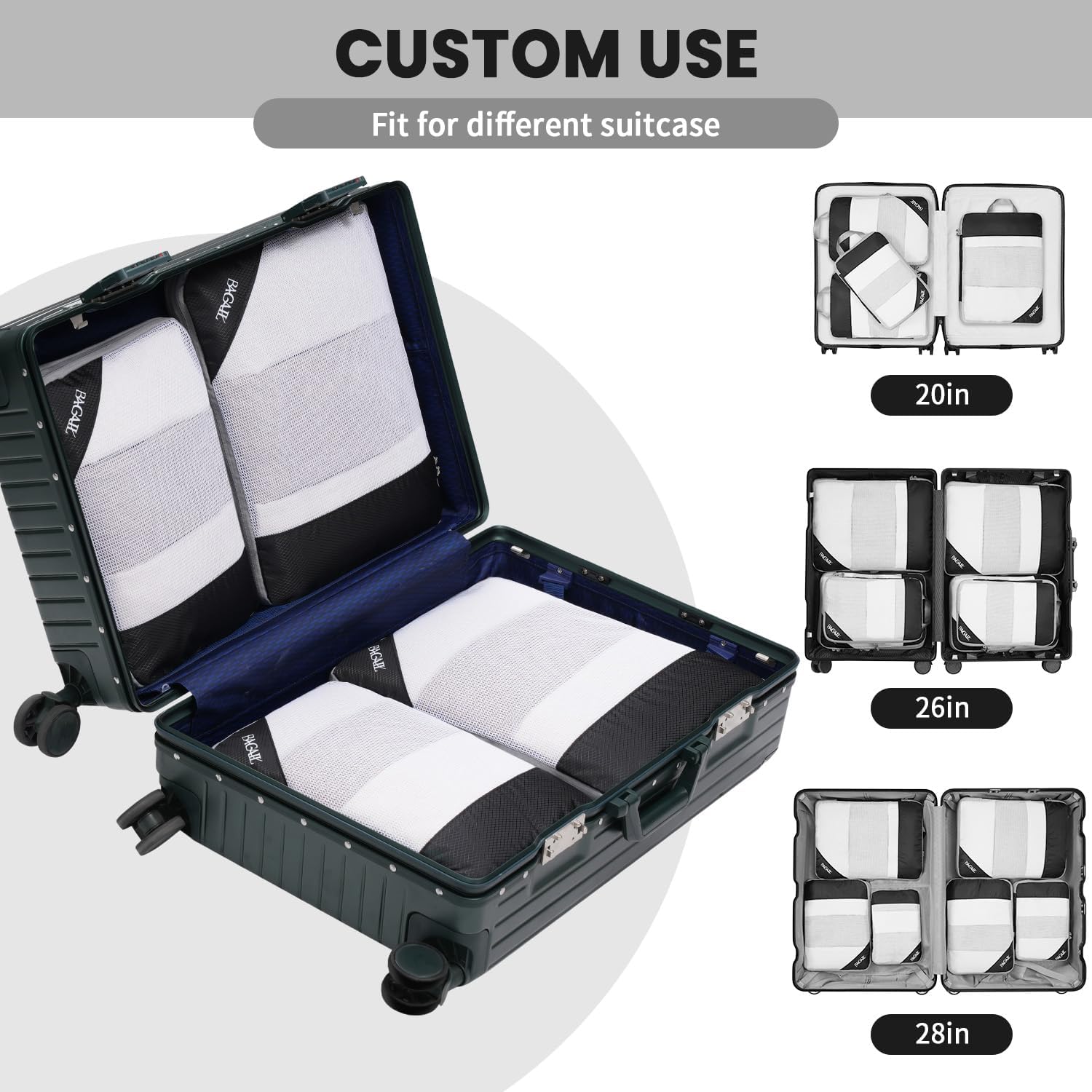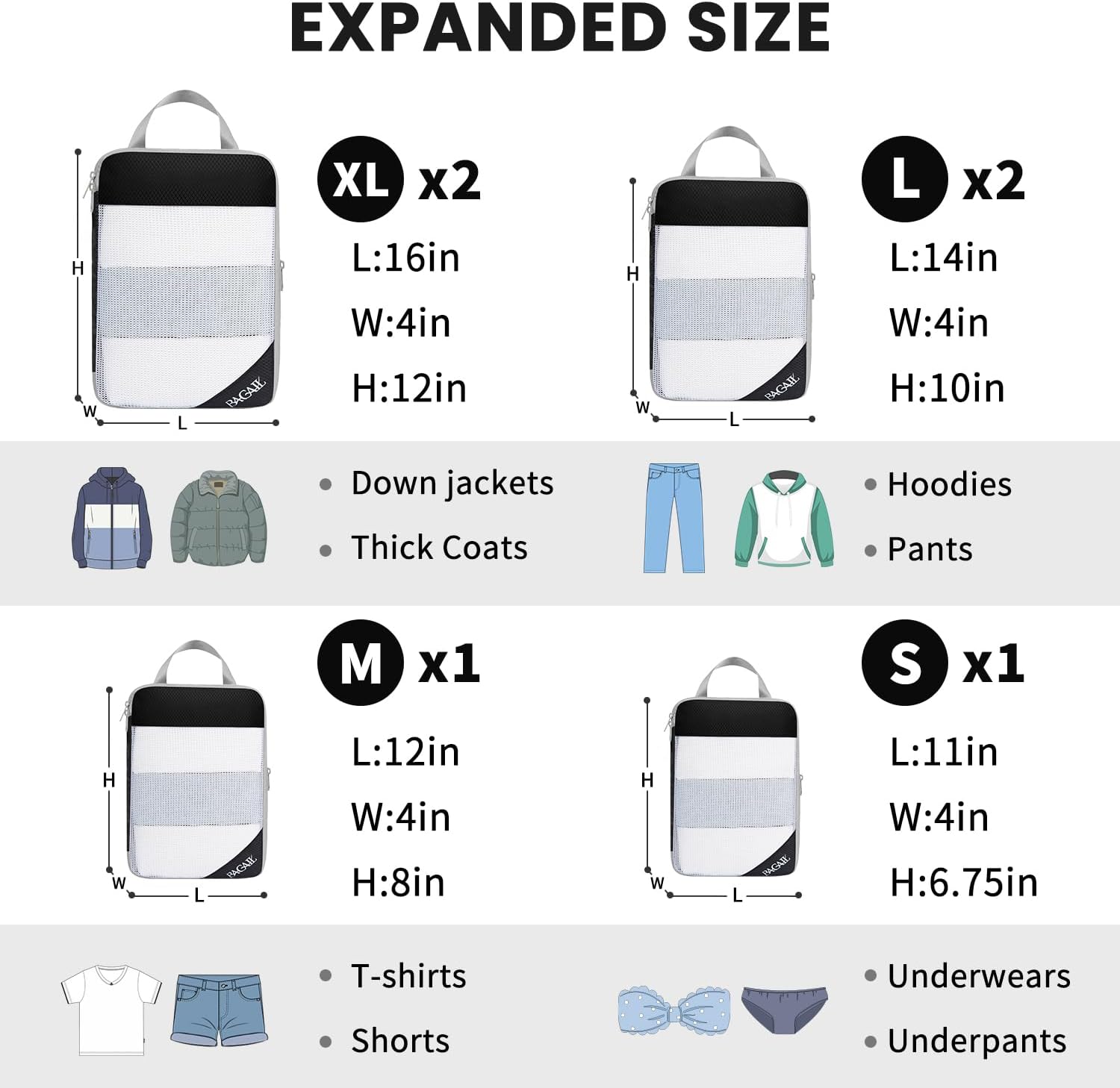Multiple Sizes: Includes different sizes of compressible packing cubes, which can store many types of clothes, such as jackets, pants, underwear etc. You can mix and match freely to meet the needs of 3-7 days traveling