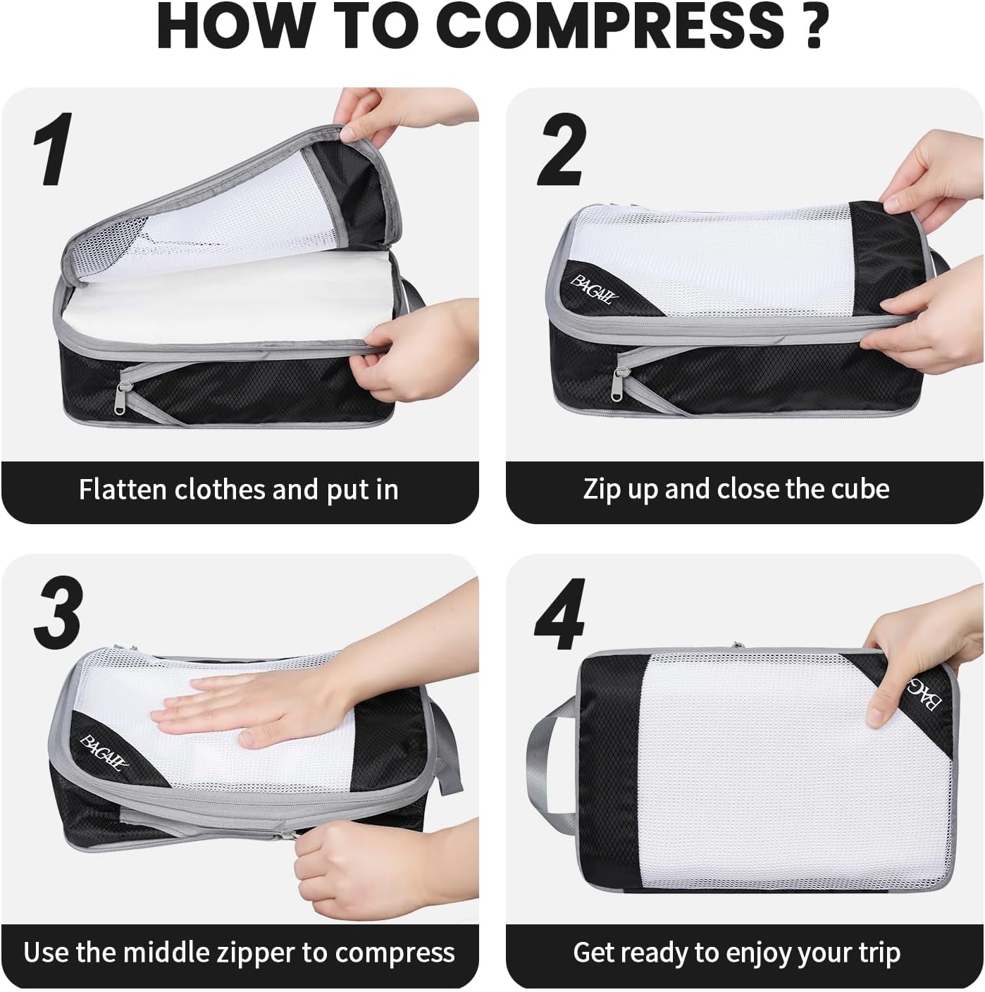 How to Compress:The cube is compressed by the middle zipper; Using steps: 1)Fold and flatten clothes 2)Pack clothes in the cube and zip the front zipper 3) Put a finger on the back of the middle zipper when compressing to avoid zipper get stuck in fabric