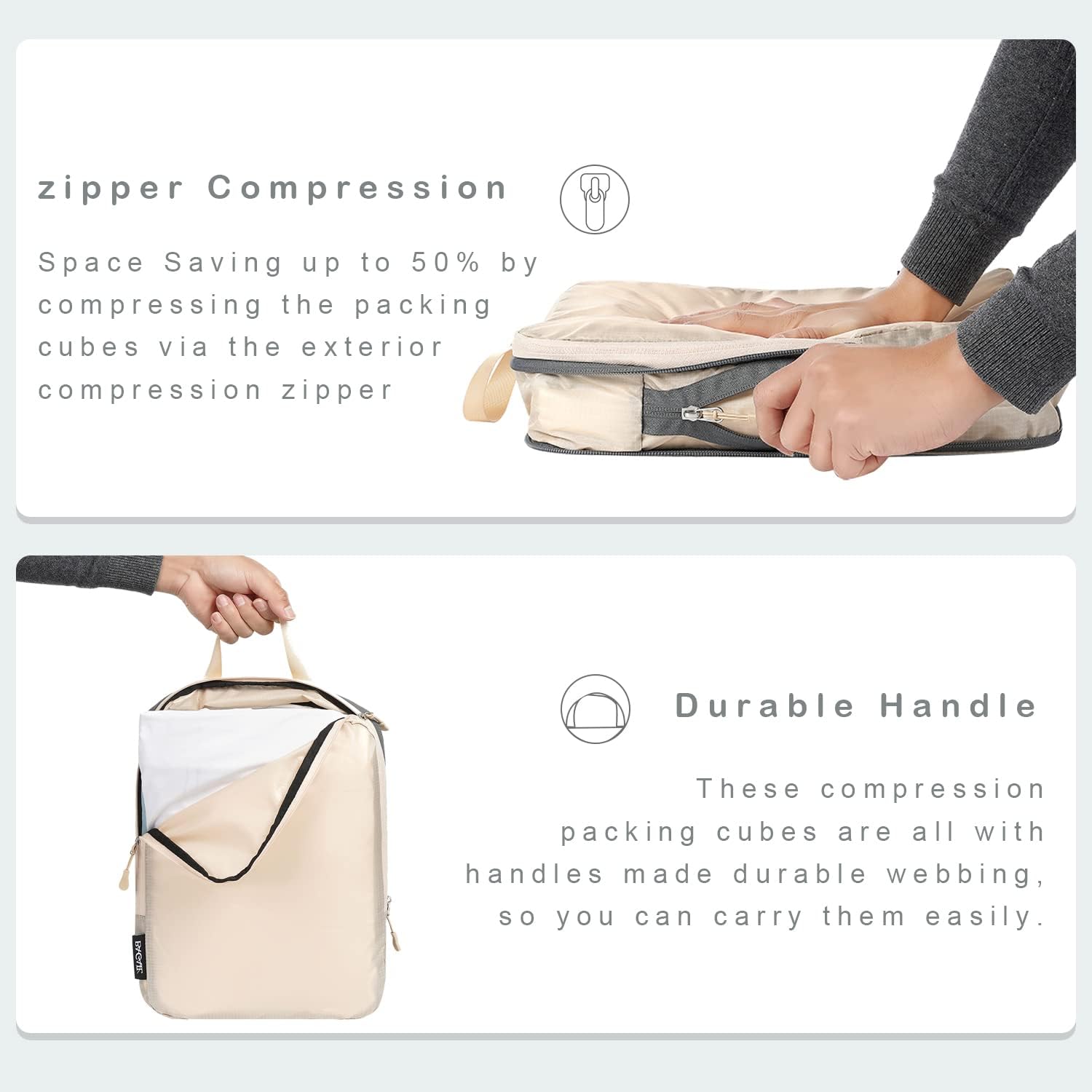 Space Saving-Save up to 50% space by compressing the packing cubes via the exterior compression zippers. And all the zippers we use are SBS zippers, which is smooth and durable, it makes sure the packing organizers could be opened and closed easily.