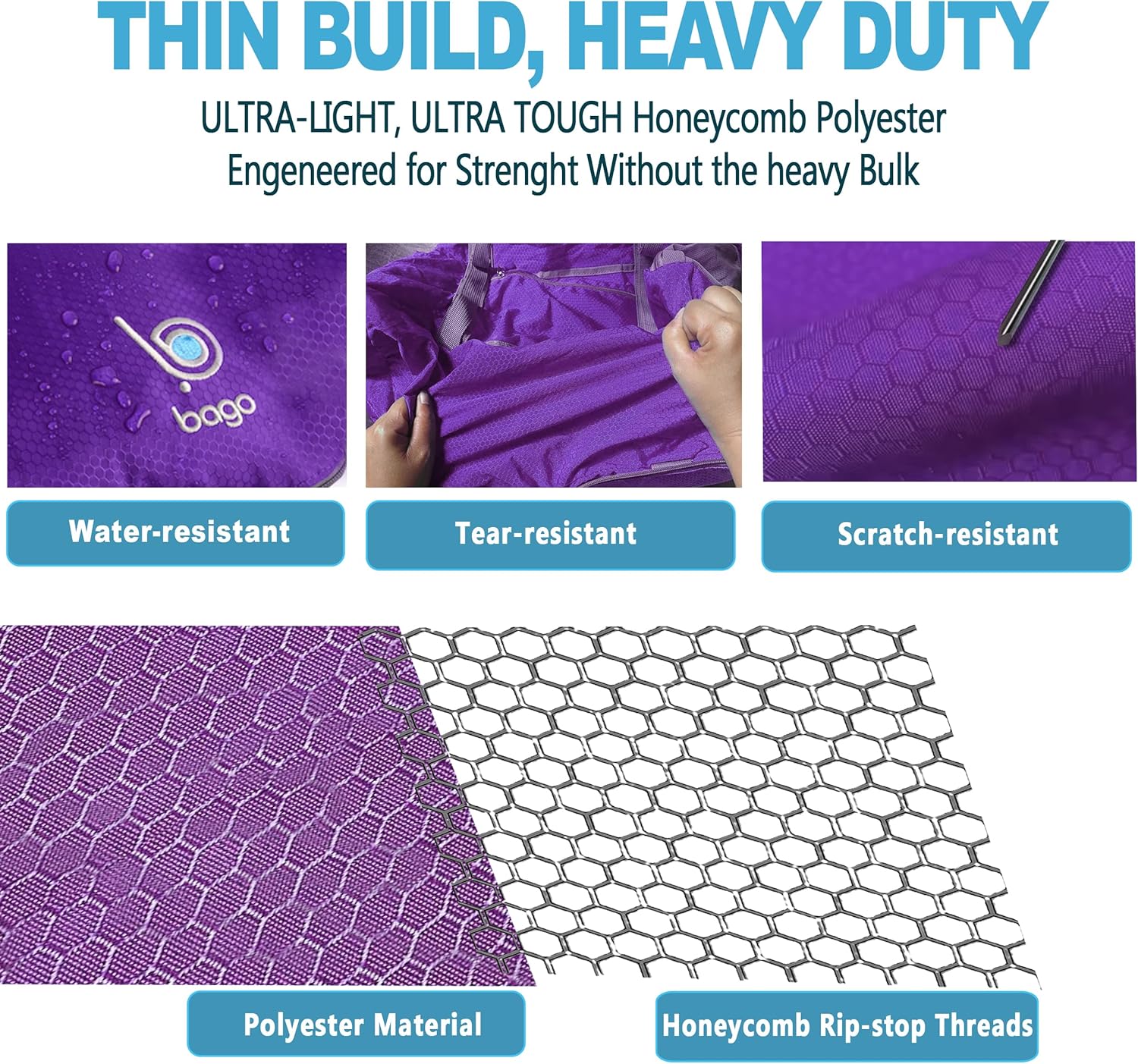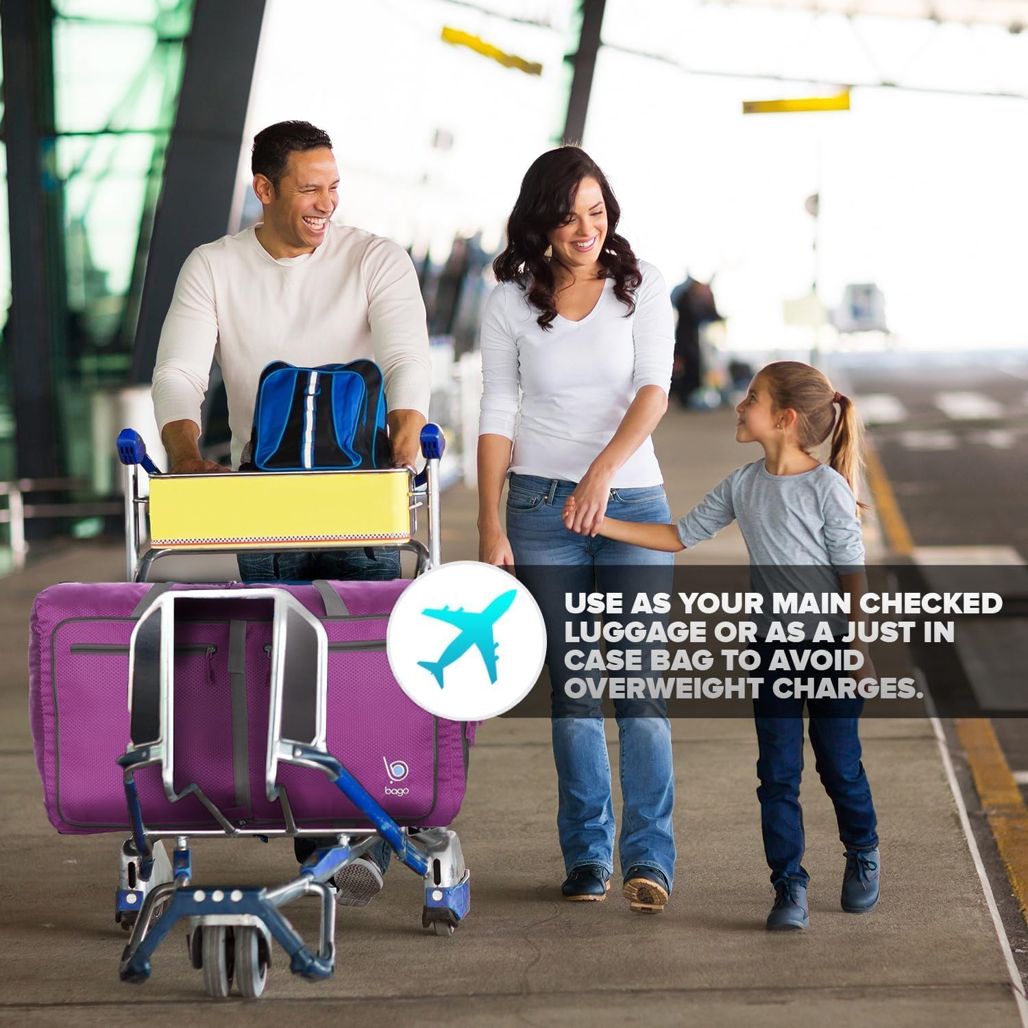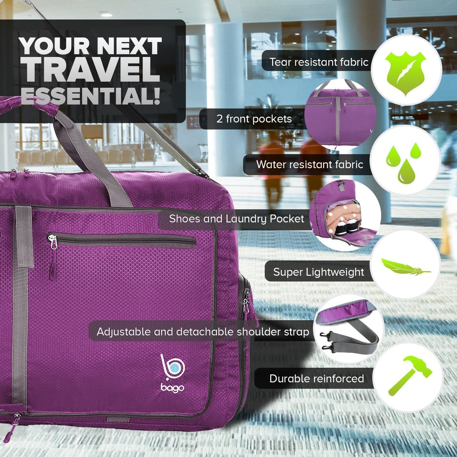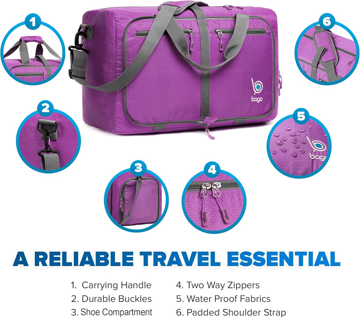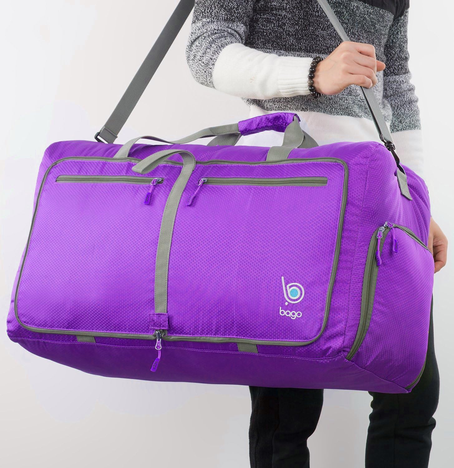 Bago Large Foldable Duffel Bags for Traveling Women & Men – 80L Packable Duffle Bag for Travel with Shoe Compartment – Water Repellant, Heavy Duty, Lightweight Folding & Collapsible (Purple)