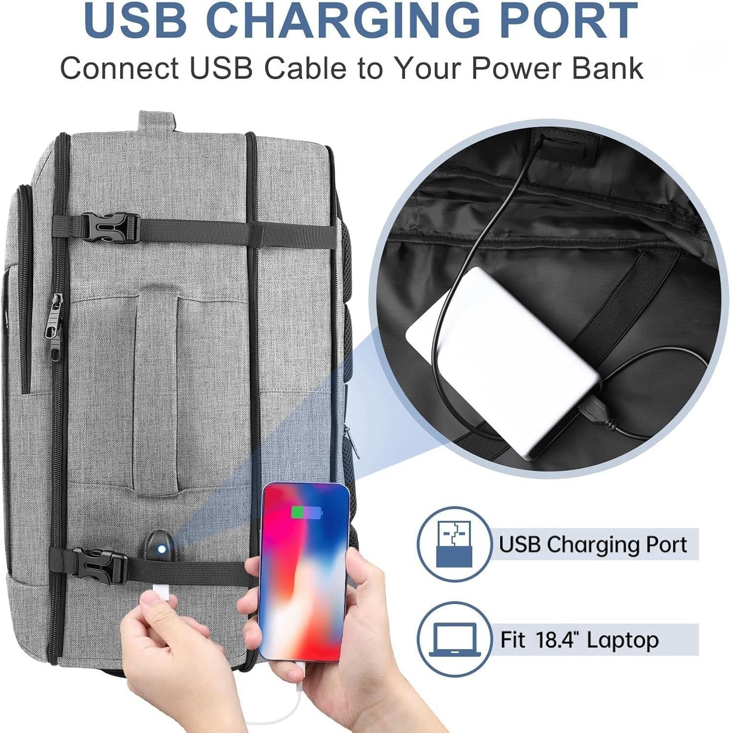 Usb Charging Port: The travel backpack features a built-in USB charger outside and a charging cable inside, providing a convenient way to charge your phone while walking. It is important to note that the backpack does not include a power bank and does not power itself. The USB charging port is designed solely for charging purposes. With this added convenience, the backpack offers a practical solution for people who are frequently on-the-go and need to keep their electronic devices charged.