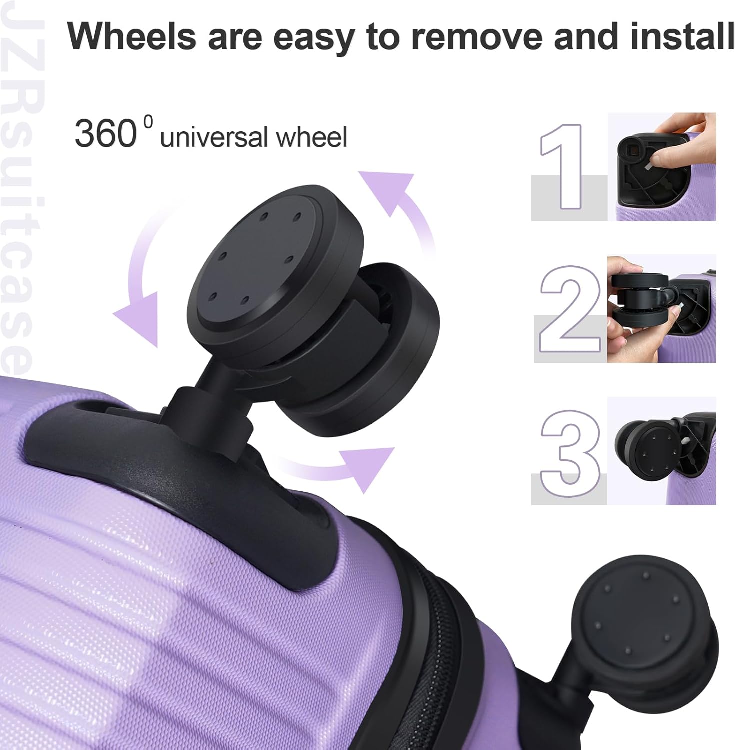 360° Silent Wheel:360°Spinner Double WheelsRolling suitcases with wheels with soft rubber and lubricating balls inside wheels which could moves silent and smoothly. The luggage set with spinner wheels make you more easy to carry it. Moreover,the wheels are detachable so we can easily replace them.(If the wheels of the luggage are damaged or lost, please contact us through Amazon to replace them in a timely manner.)