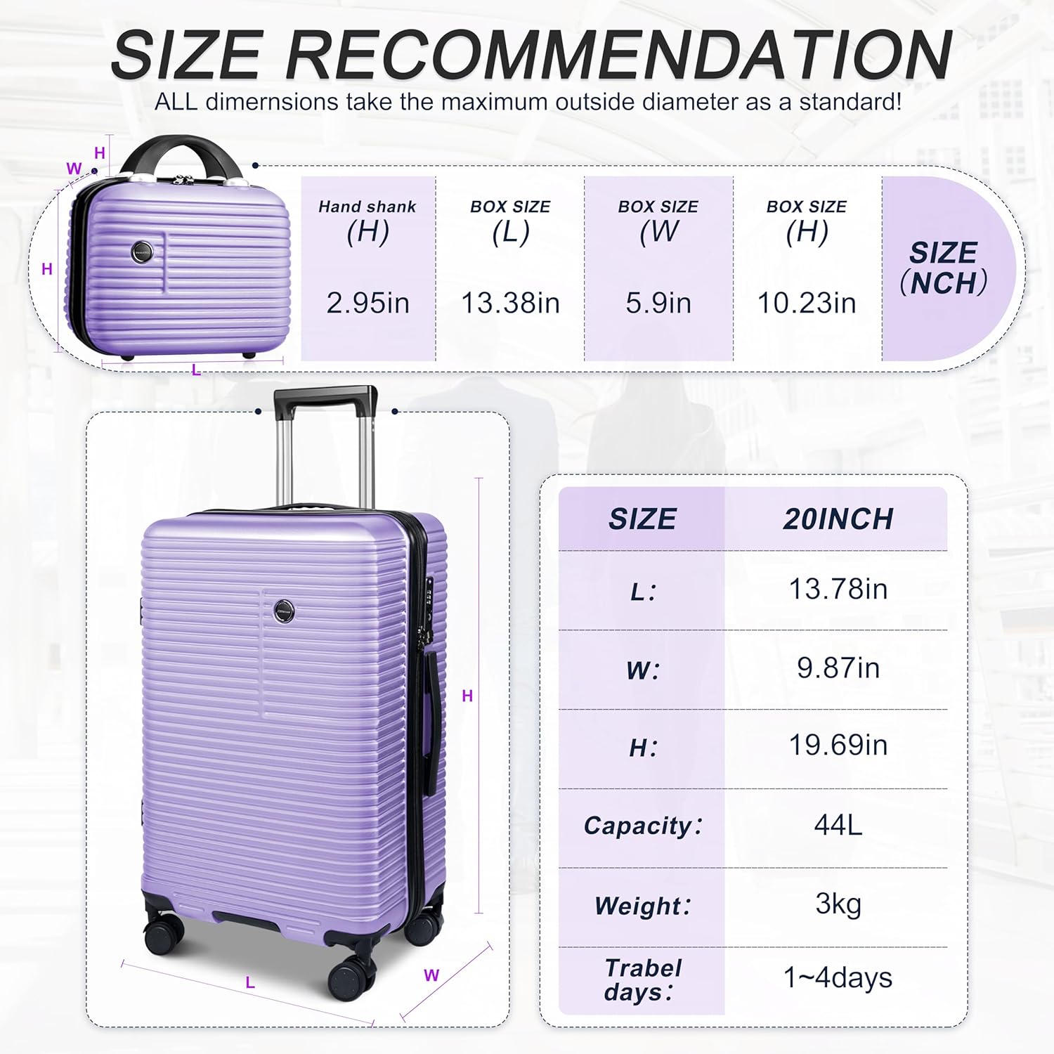Packing Include: 2-piece luggage sets includes 14inch Cosmetic Case and 20inch Carry On Luggage. Made by ABS & PC brushed surface layer, which is wear-resistant, scratch-resistant, waterproof and high temperature resistant,as well as easy to clean.
