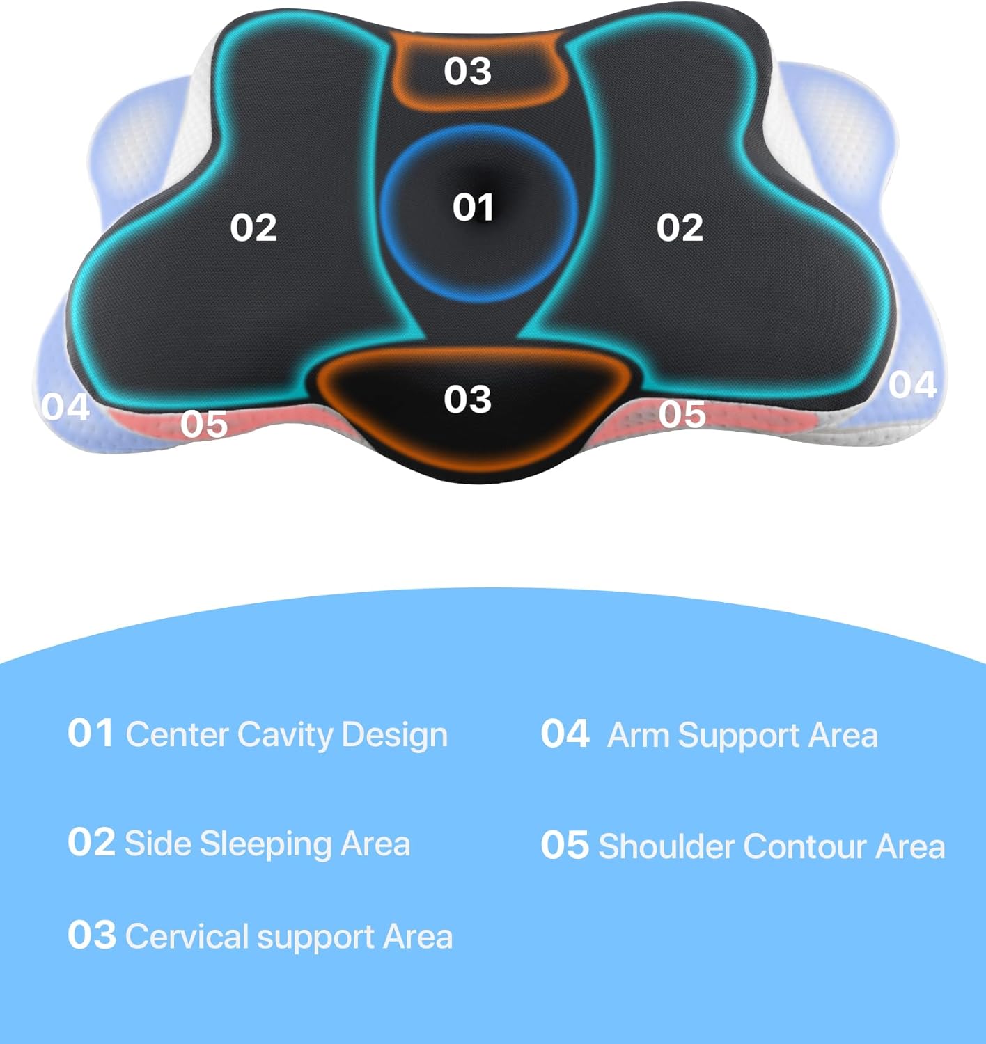 【Ergonomic Pillow】5 areas have been specially designed based on the natural curves of the human body – the neck, head, shoulders, and arm areas,which gives 360° Ergonomic Support.This cervical neck pillow adapts to all sleeping positions (side, back, or upright). High-resilience memory foam fills gaps between the neck and shoulders, this neck pillow travel prevents nerve pressure during flights, road trips, or desk work.