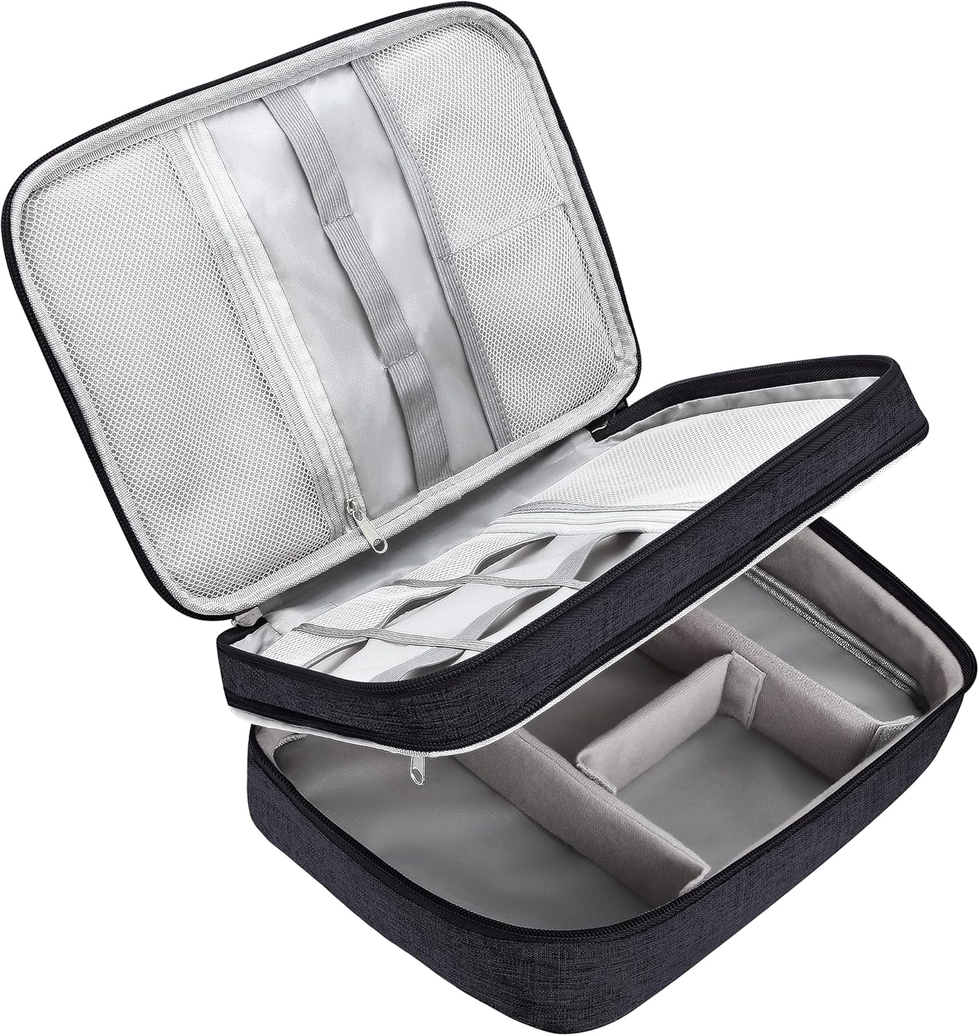 【DOUBLE LAYER DESIGN】 — The electronics organizer bag is designed with 2 Layers interior compartments, the upper compartment can be used to organize small items, like cables, USB, chargers, the lower partition to store larger items, like adapters, external hard drives, kindle and other travel accessories. Besides, the padded dividers are adjustable and you can adjust them for your daily needs.