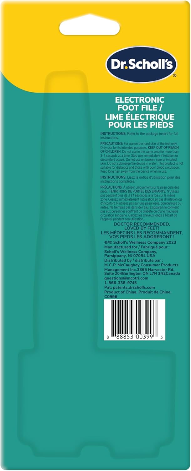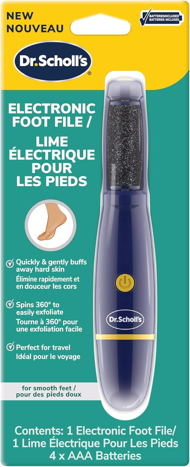 Revitalize your feet effortlessly with the Dr. Scholl’s Callus Remover Electronic Foot File, designed to gently and quickly buff away tough, callused skin. Glide the file over the feet while the roller head automatically rotates 360 degrees to remove rough, hard skin, leaving your feet feeling smooth and comfortable. Helpful for both men and women, the electronic file effortlessly removes hardened skin to reveal the soft, rejuvenated layers beneath. The compact design makes this device a perfect travel companion. Batteries are included, making this a convenient solution for your exfoliation needs.