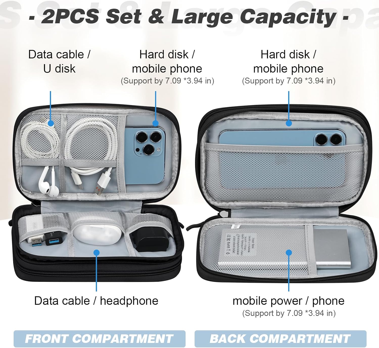 【Double Layers Design】This electronics organizer has 2 internal compartments.The front compartment of the tech pouch has 5 small mesh pockets for storing data cables, earphones and other small items, and there is also a compartment for storing mobile phones or hard drives;The rear compartment of the cable organizer bag is equipped with a large mesh bag that can store power banks and a mezzanine that can store mobile phones and hard drives.