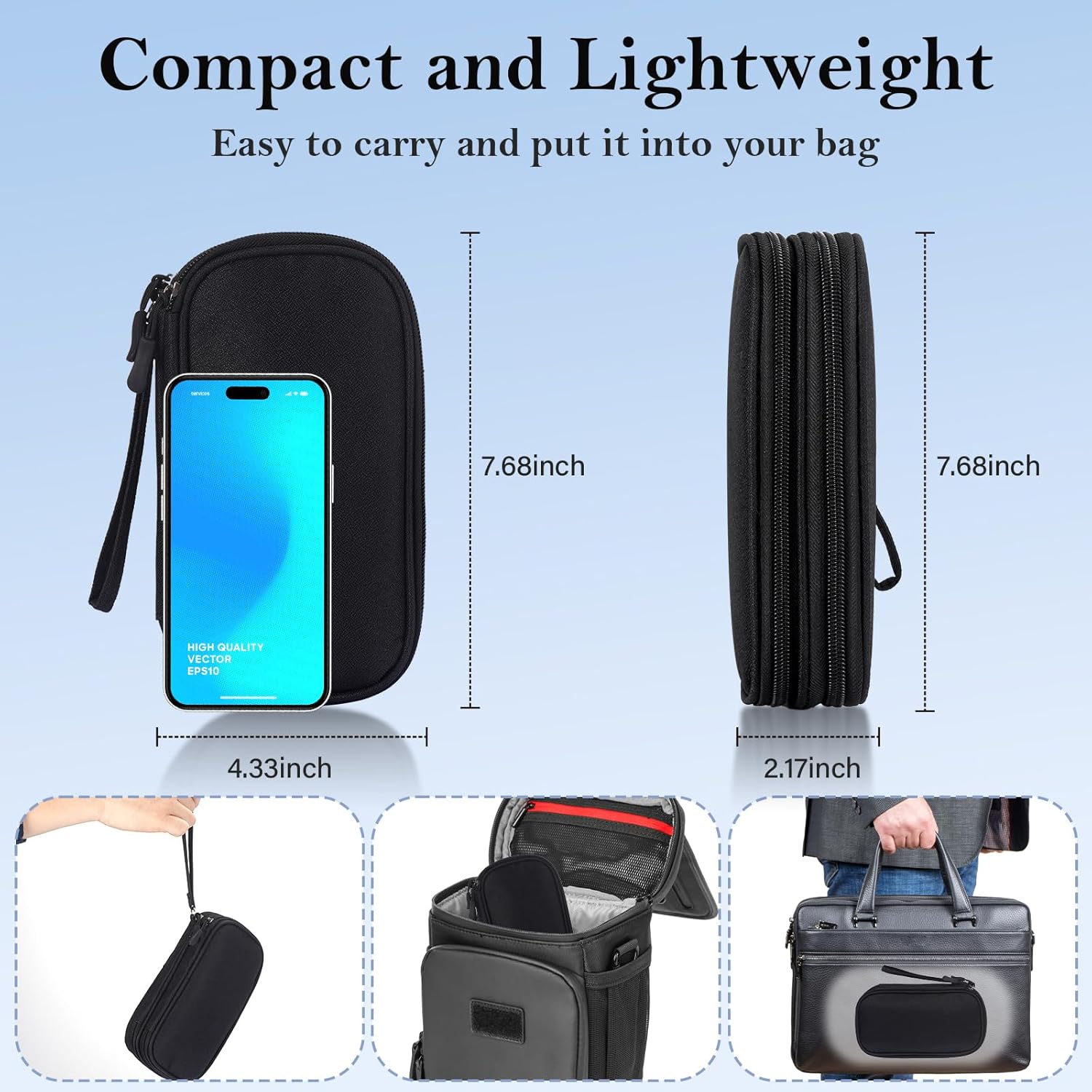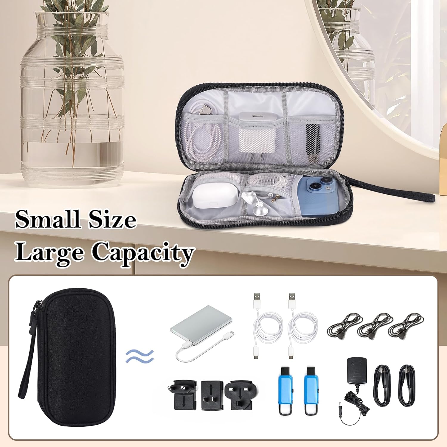 Dimensions: The dimensions of the electronics organizer is 7.68 inches x 4.33 inches x 2.17 inches.The tech bag is compact and lightweight, making it easy to carry and fit into backpacks, handbags,or laptop bags without taking up much space,our tech organizer is perfect for home use and everyday organization.