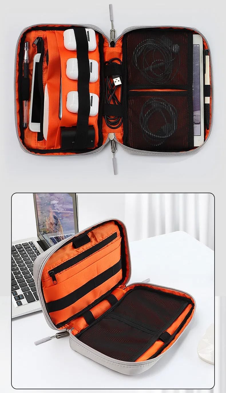 1️⃣ Smart Multi-Layer Organization Say goodbye to tangled cables! This travel organizer features 1 main compartment, 2 mesh pockets, 1 soft-lined zipper pouch, 3 dividers, 6 elastic loops, and 2 pen slots—perfectly storing chargers, AirPods, power banks, adapters, and more. Keep essentials visible and accessible with clear partitions!