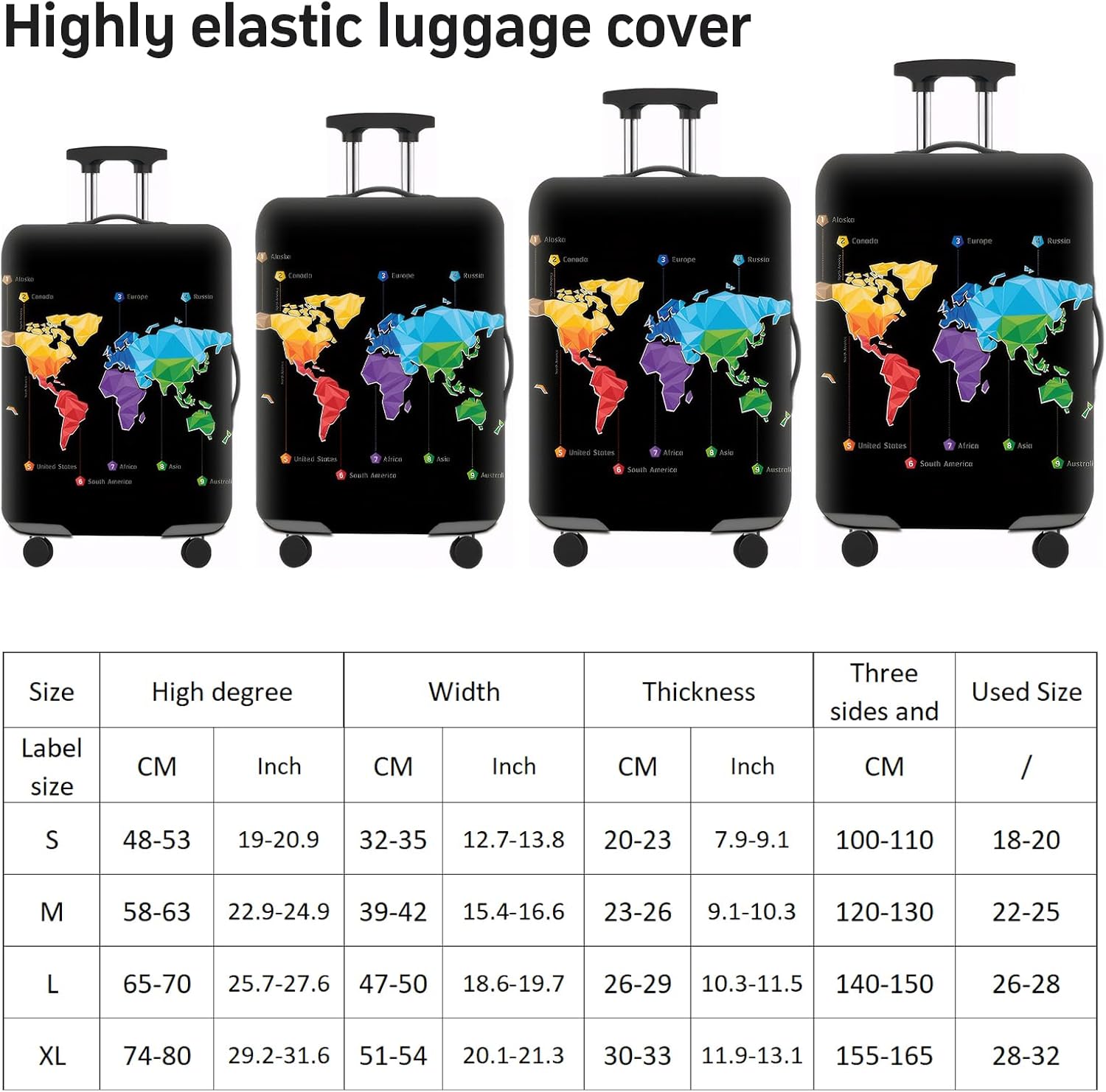 Size: 4 sizes available to fit almost any luggage. size S fits suitcases from 18 to 21 inches; size M fits suitcases from 22 to 25 inches; size L fits suitcases from 26 to 28 inches; size XL fits suitcases from 29 to 32 inches. Please measure the size before you buy, otherwise your luggage size may not match with the luggage cover size.