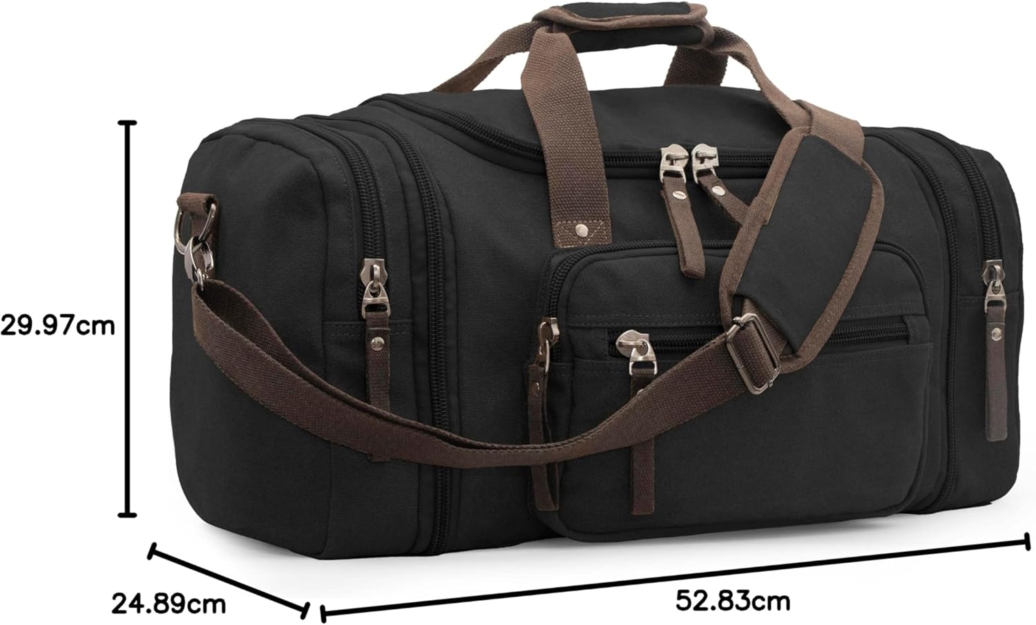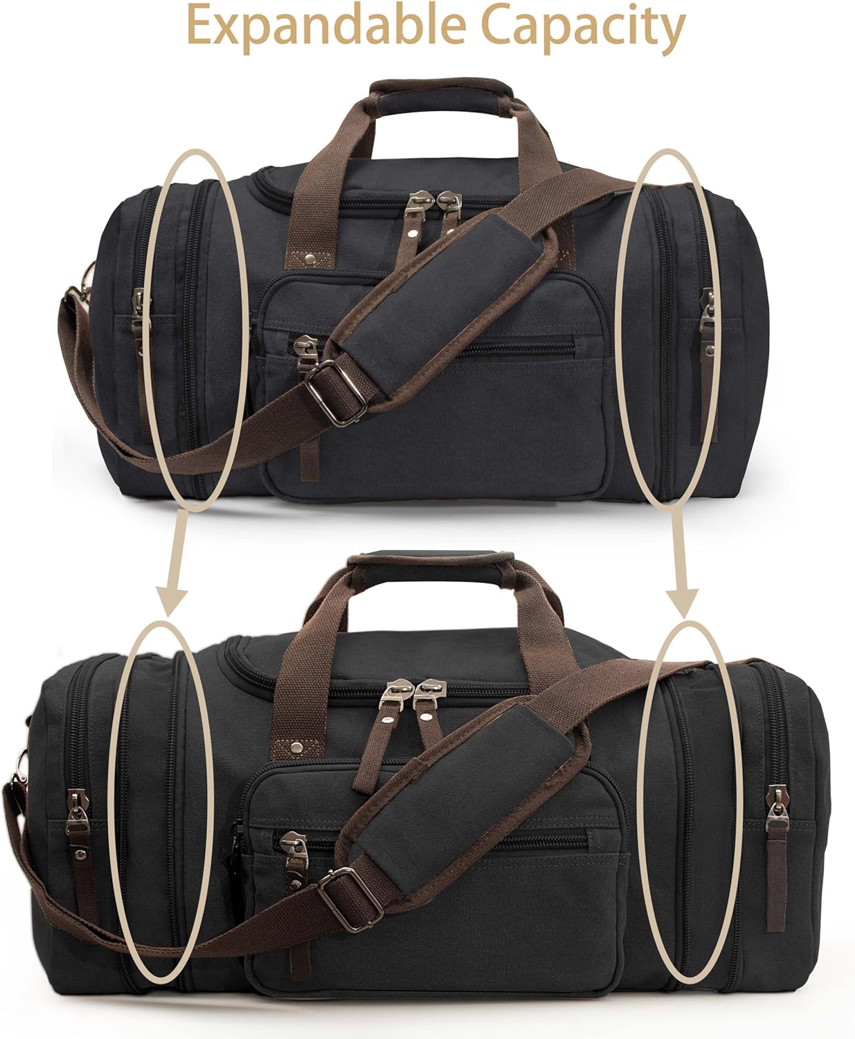 【Expandable Capacity】Size: 20.8” (L) x 11.8” (H) x 9.8” (W). The unique expansion design allows both side pockets to be extended using zippers based on your specific needs, making it ideal for 3 to 5 day short trips. It includes 2 side pockets, 2 front zipper pockets, 1 back zipper pocket, and 1 inner zipper pocket.