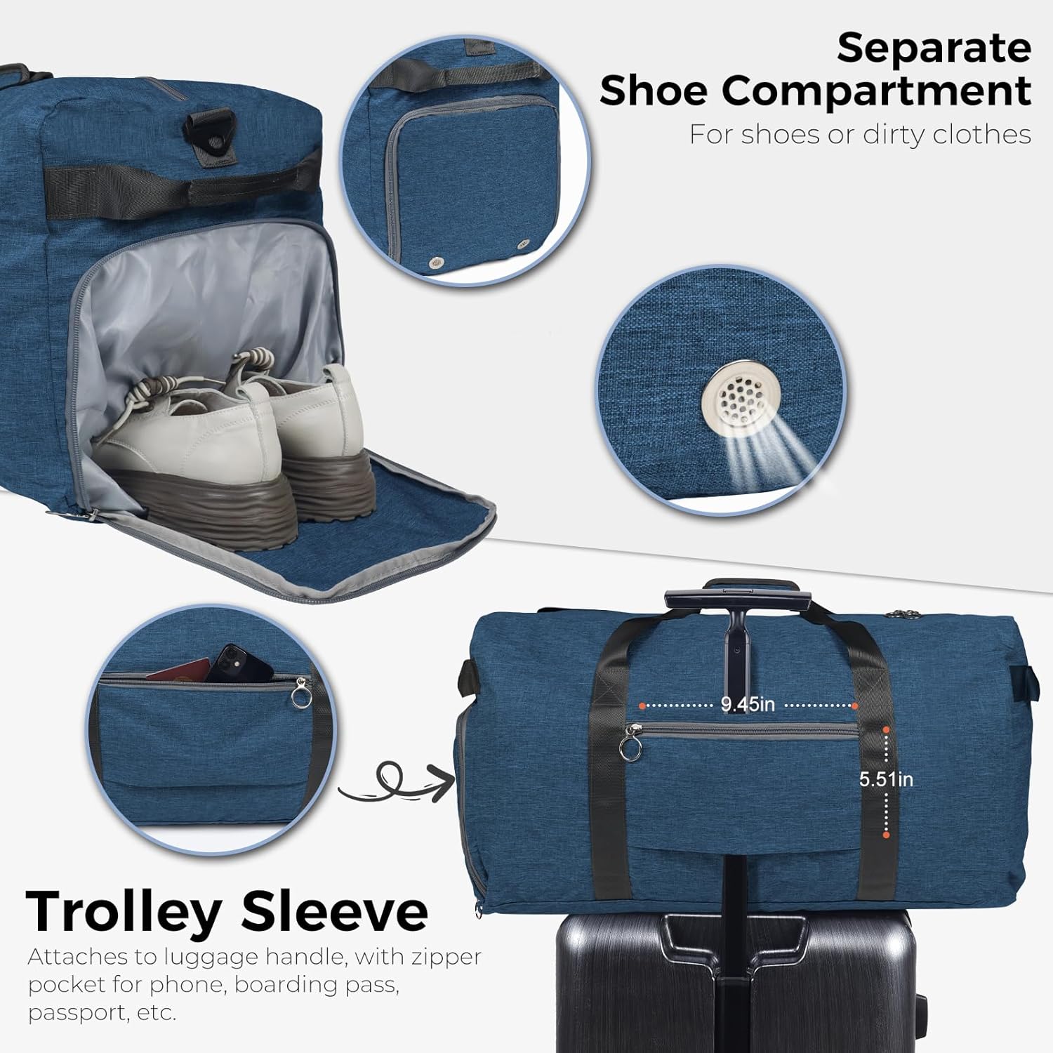 6 Practical Pockets: Includes 1 roomy main compartment, 2 front zipper pockets, 1 side shoe pocket with vents, 1 inner pocket for valuables, and 1 back pocket that can slide over luggage handles