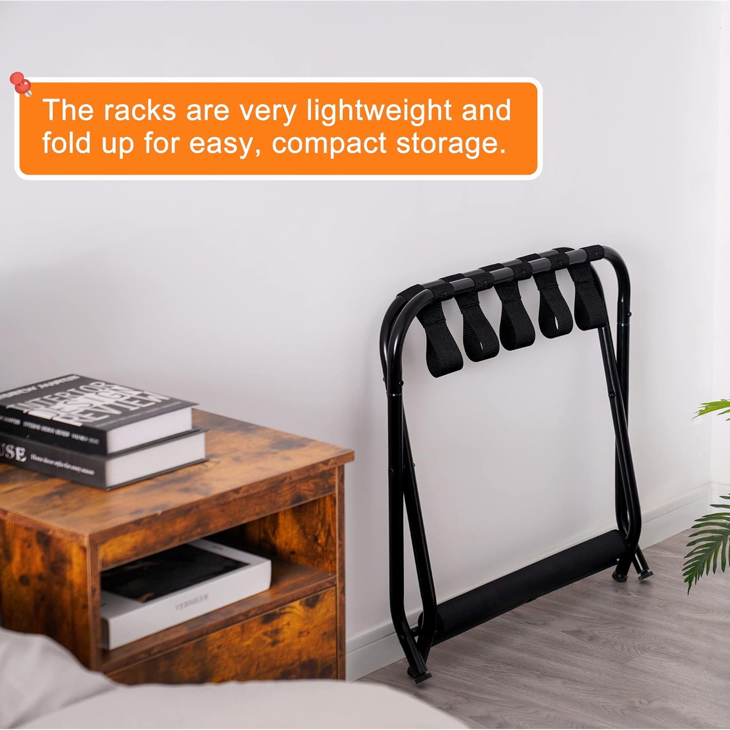 Awesome addition for guest room: It was sturdy enough to hold a huge suitcase.Having the extra shelf allows storage for a tote bag or Shoes. The racks are very lightweight and fold up for easy, compact storage.