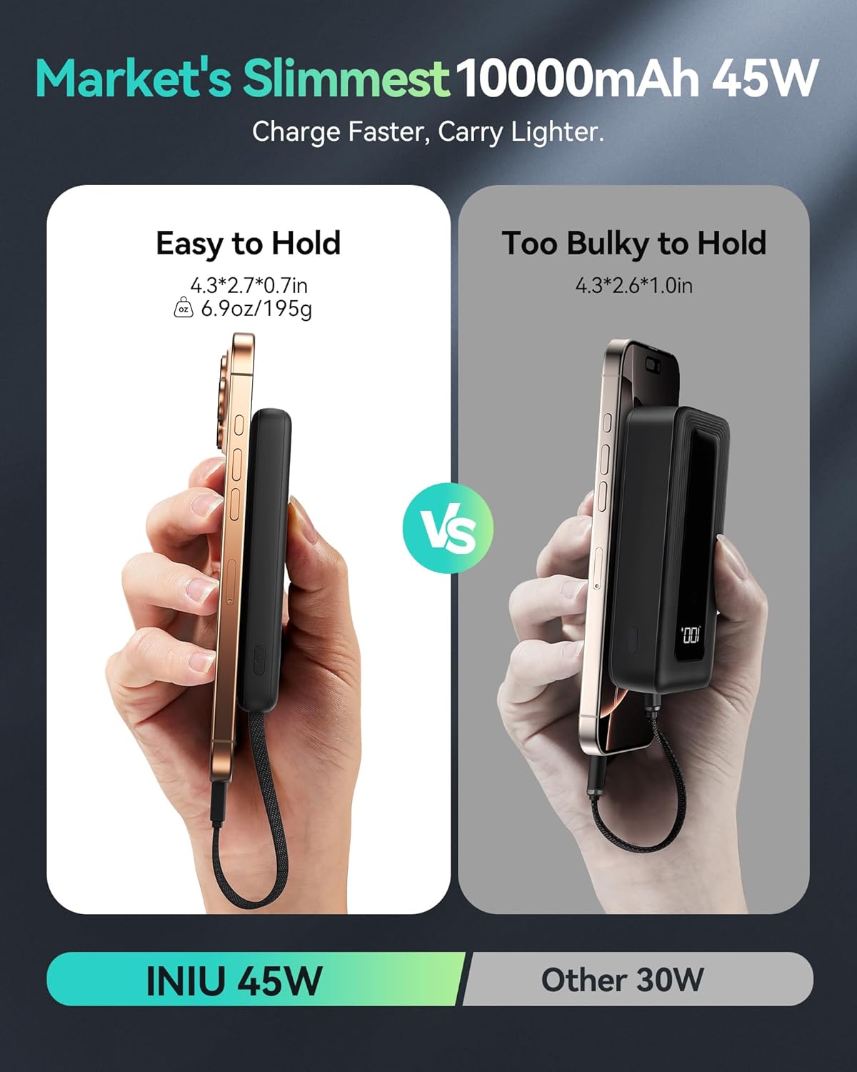 INIU 45W Portable Charger, 10000mAh Power Bank with Built in USB C Cable, Small USB C in&Out Fast Charging Powerbank, Phone Charger Battery Pack for iPhone 17 16 15 Pro iPad Samsung S25 S24 Google etc