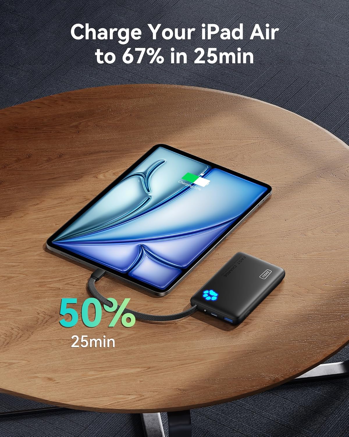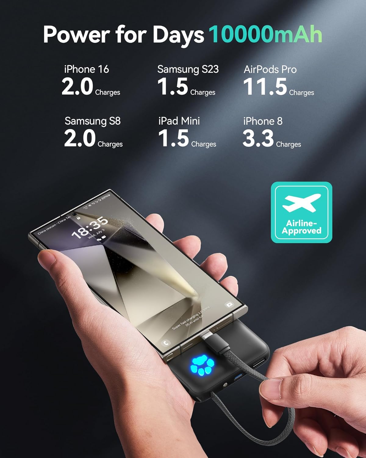 Grab & Go, No Extra Wires Needed: This 10000mAh power bank features a built-in USB-C cable that charges both your phone and the power bank and doubles as a lanyard. Leave home without extra cables.