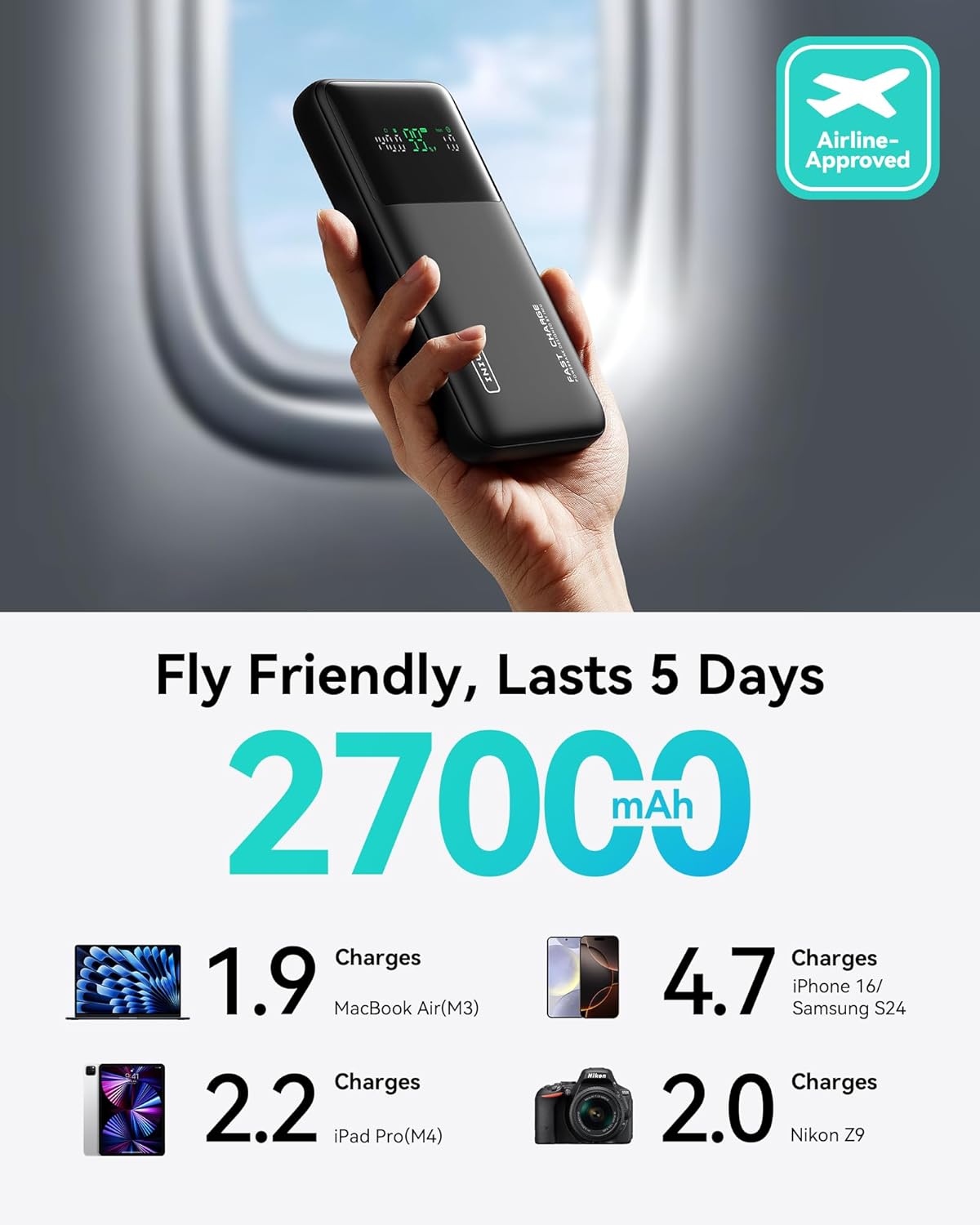 [Massive Airline-Approved 27,000mAh] With a whopping airline-approved 27,000mAh battery capacity, it gets multiple charges for all your devices(including the latest iPhone 17) on the go in recharge once.