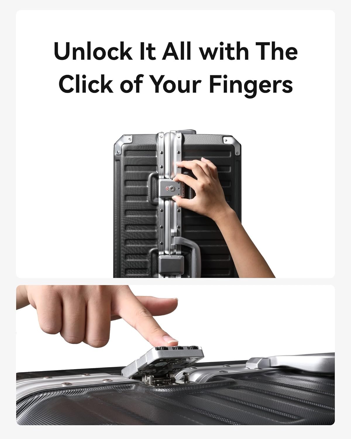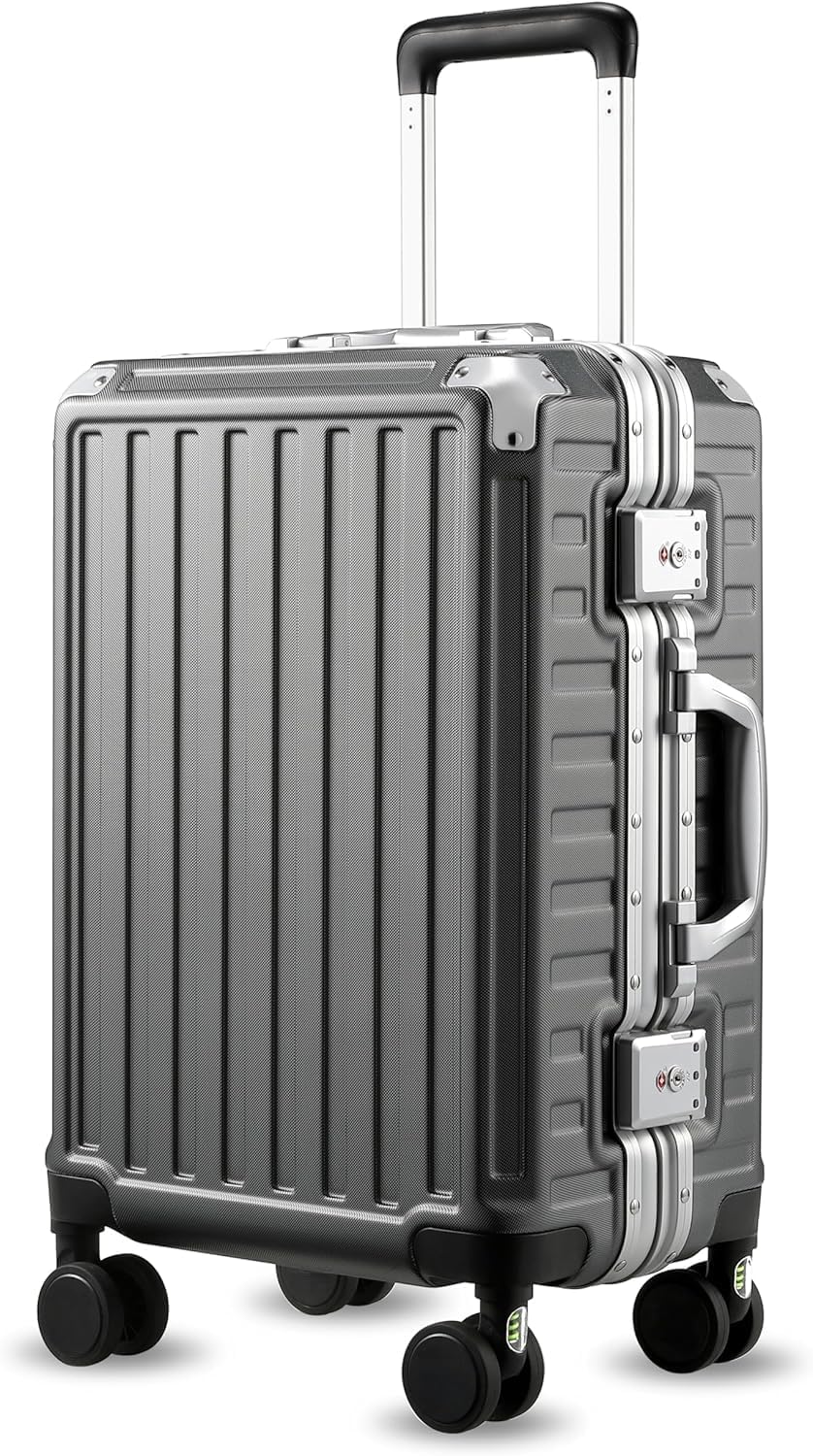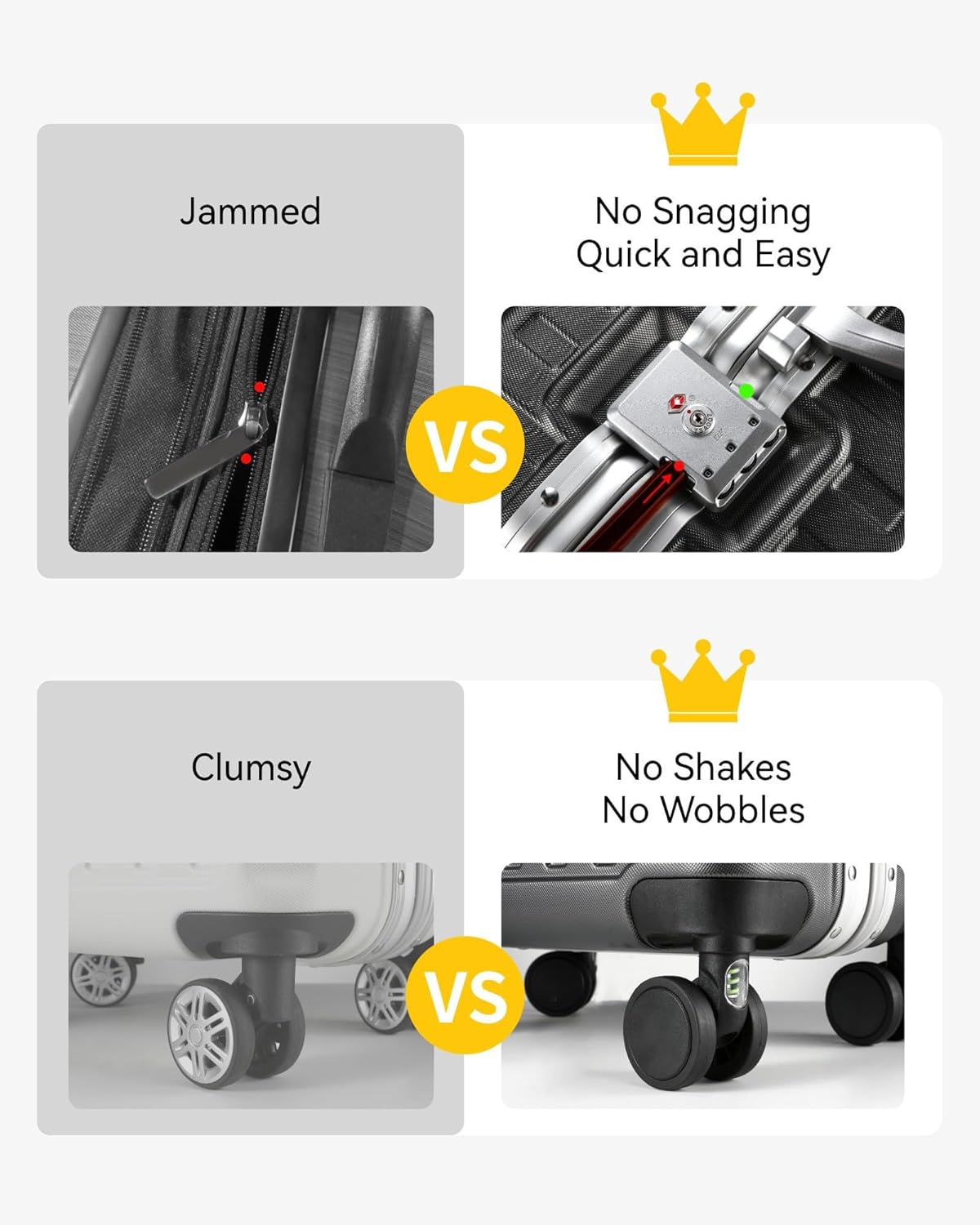 Aluminum Frame + Premium PC Material: This carry on luggage for airplane features a one-piece molded aluminum frame for enhanced deformation resistance and structural reinforcement, combined with a high-performance PC case that offers superior toughness and resilience compared to standard ABS+PC blends – ensuring 360° comprehensive protection for ultimate luggage safety.