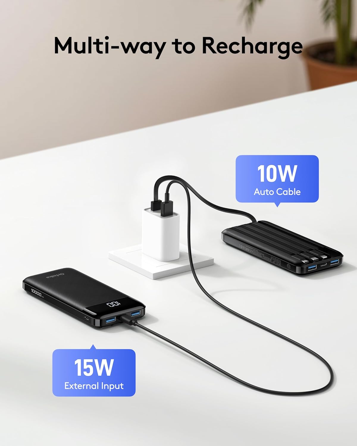 【4-in-1 Built-in Cables, Compatible with 99% of Device】No more tangled wires and power your device anytime and anywhere! This battery pack power bank comes with built-in cables to charge any device: Type-C for iPhone 16/15 series, iPad 10, Samsung, Google, and other Android phones; iOS cable for iPhone 14/13/12 and iPad 9 and other older Apple devices; Micro cable for low-current devices like portable fans. USB-A to recharge the powerbank itself-perfect for on-the-go top-ups. No matter what device you have, is this the most widely compatible product
