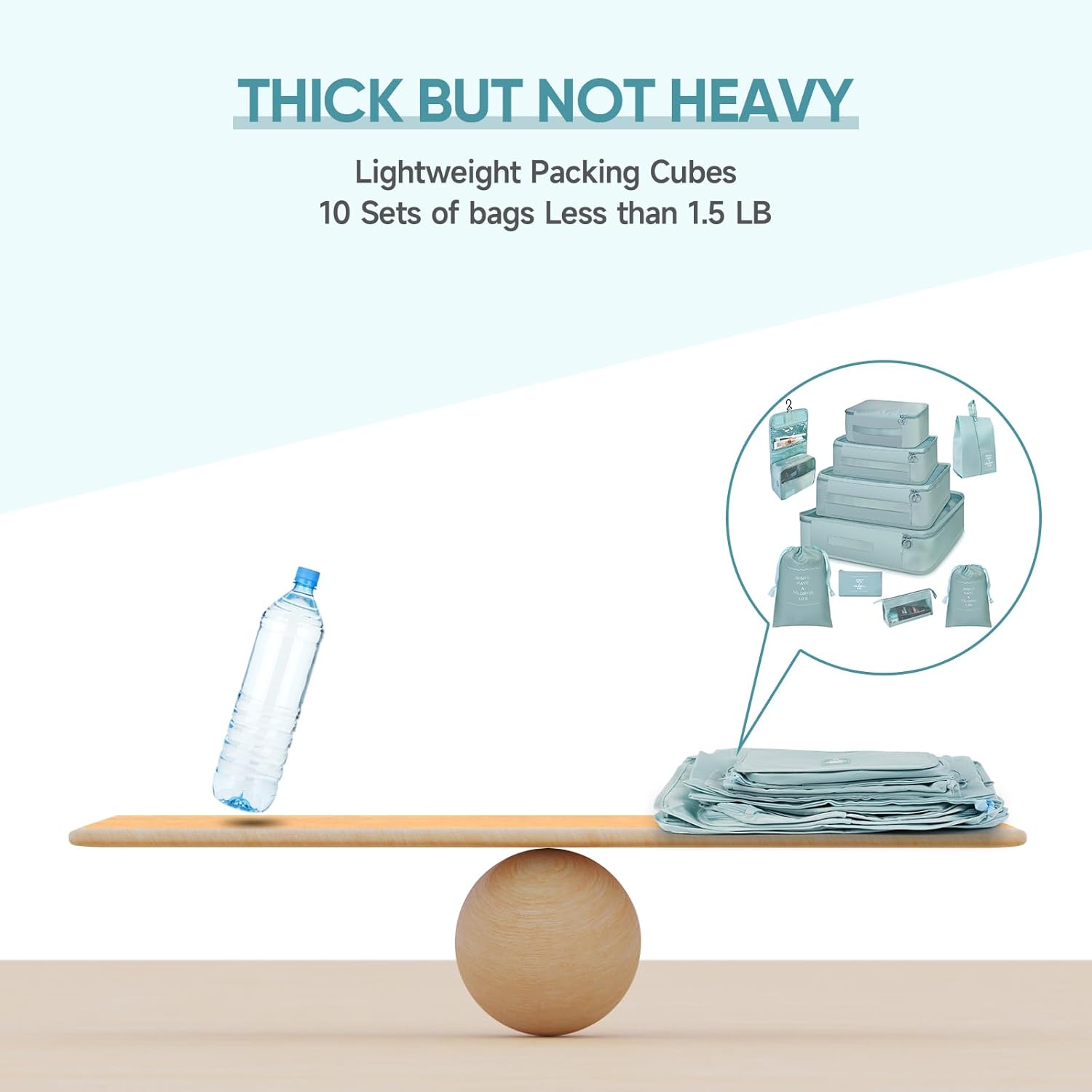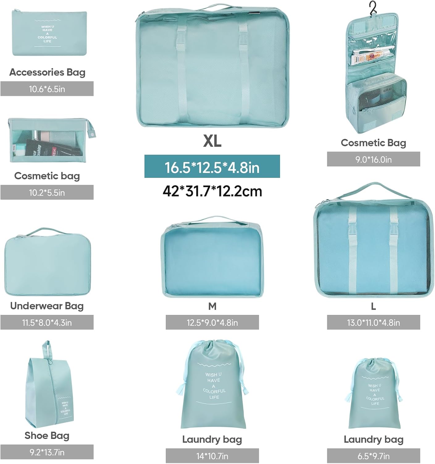 [10 Pieces Value Travel Packing Set]: This Packing Cube Set includes Packing Cube*4, Toiletry Bag*2, Laundry Bag*2, Accessory Bag*1, Shoe Bag*1. Different sized travel essentials set organizes clothes, dirty laundry, bras, underwear, shoes, makeup, towels, toiletries and electronic accessories. These helpers keep your luggage organized during your trip and once you arrive at your destination.