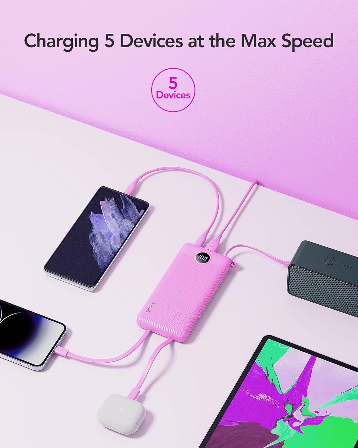 Portable Charger 10000mAh,VRURC Slim LED Display Power Bank, 5 Output 2 Input Cell Phone Battery Pack, Built-in Micro & USB C Cables Phone Charger Compatible with iPhone,Samsung,Android etc-Rose Red