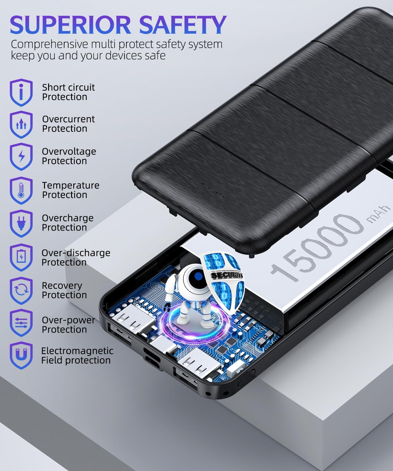 Portable charger has an impressive 15000mAh ultra-high capacity, can provide you with an excellent battery life experience. No more worrying about your phone running out of juice during outdoor activities like hiking. Enjoy a worry-free and wonderful trip with this reliable companion.