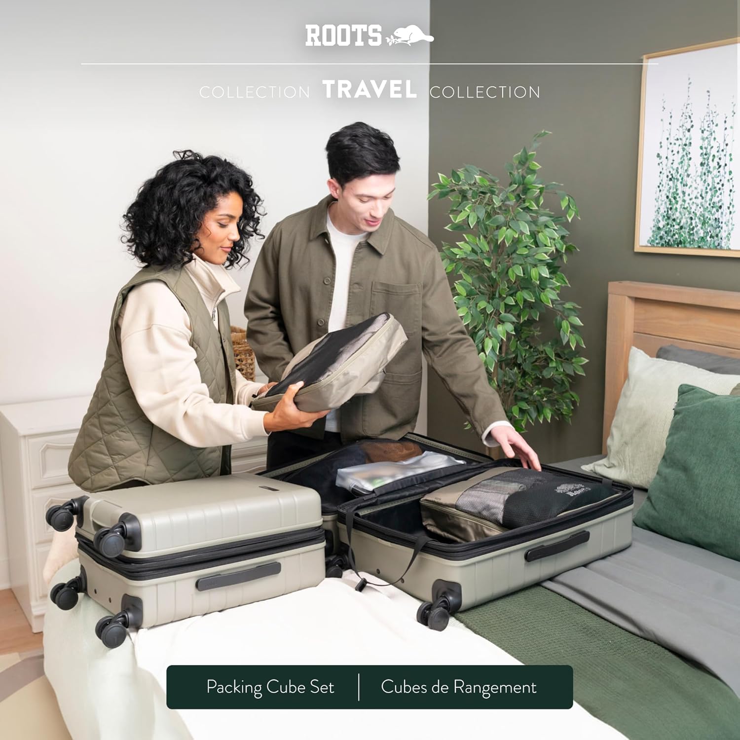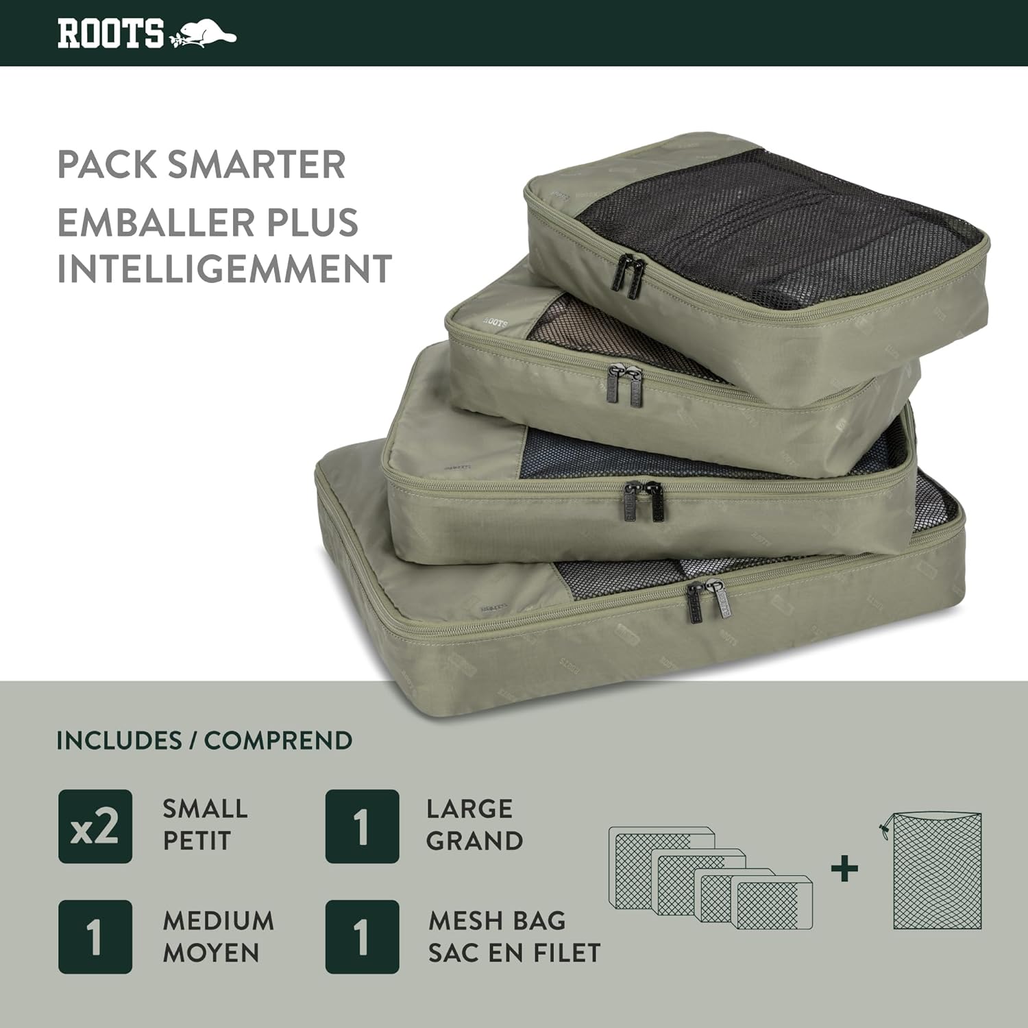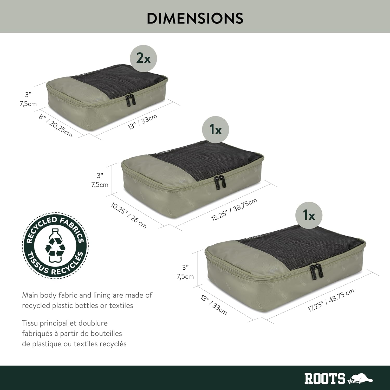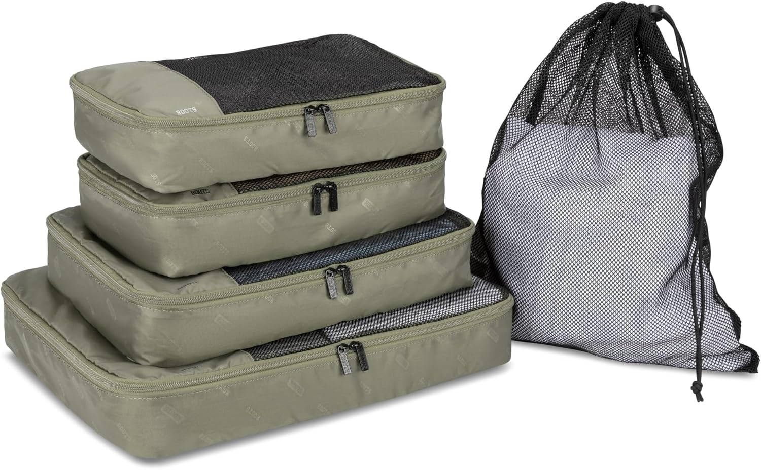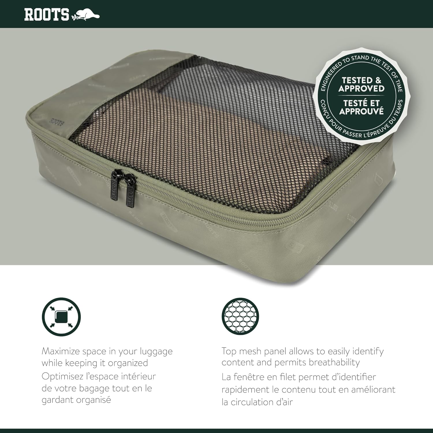 Gone are the days of clothing and toiletries bursting out of your luggage the moment it’s unzipped. No more sitting on your suitcase to squeeze it closed. ROOTS Packing Cubes will transform the way you pack your bags. This 5 piece set is carefully designed to help you better organize your suitcase with three practical sizes: small, medium and large. Each zippered cube is made from recycled nylon and features a mesh top, so you can see exactly what’s inside before you open it. We’ve also included a laundry bag to keep your dirty items stored separately.