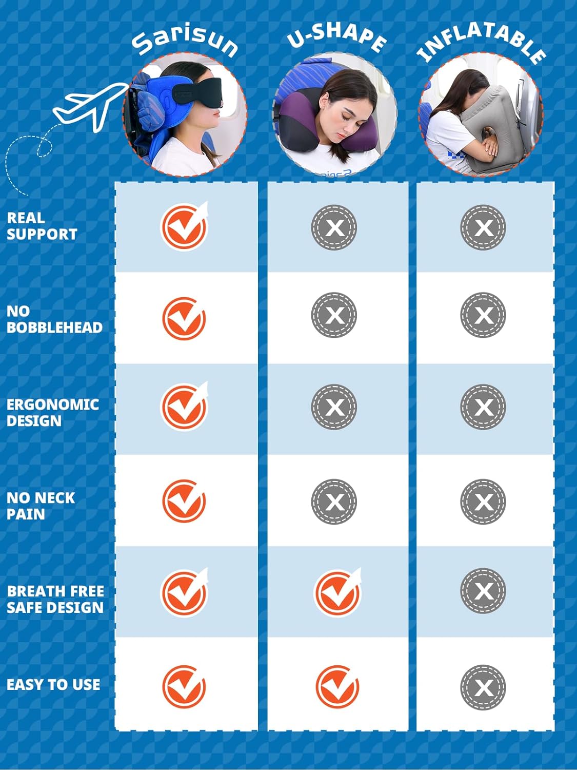 Upgraded Designed: Compatible with Airplane Seats WITHOUT Headrest too. And Enhanced Neck Support: Start enjoying your comfortable journey with SARISUN travel pillow – Sarisun’s Exclusively Patented Travel Pillow System.