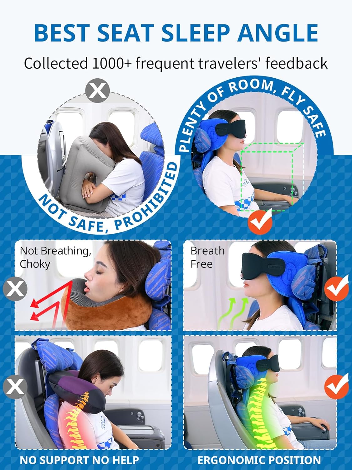 User-oriented Product: We have tested and collected for more than 1000 frequent travelers (flight and vehicle passengers), and it’s been found that the traditional types of neck pillows hardly help users sleep. We have researched in depth the seated position (especially for upright position), the ergonomic position, and how they relate to deep sleep. Stopping your head moving around is one of the most key efficient ways to fall asleep and well.