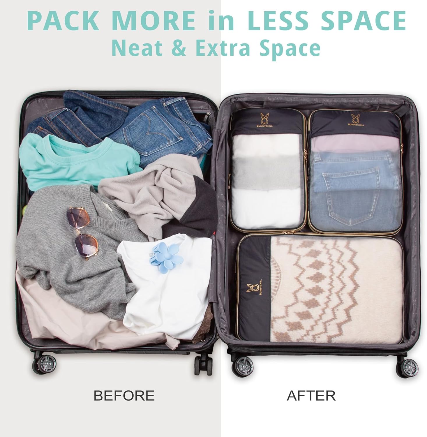 【Upgrade Your Travel Experience: Save up to 60% More Space】Revolutionize your packing game with our latest iteration featuring innovative V-shaped stripes, a game-changer for packing cubes. Our cubes boast special corner protrusions, granting you an additional 20% room to play with. With double zippers and a compression zipper system, our cubes offer the perfect blend of storage and space-saving capabilities. Say goodbye to overstuffed suitcases and hello to efficient packing!