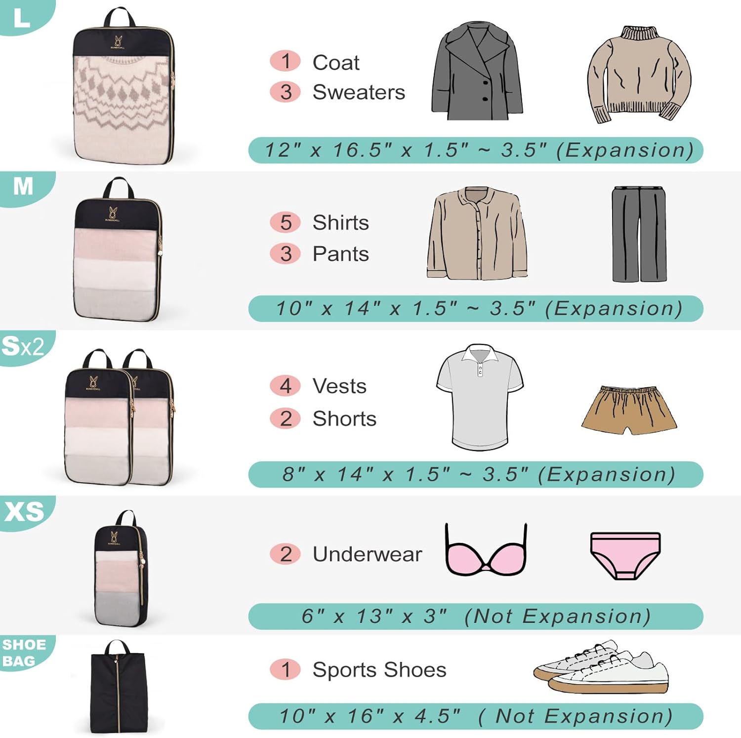 【What Will You Get】 6 set compression packing cubes includes:1 large cube (12” x 16.5”x1.5-3.5”expansion), 2 medium cubes (10” x 14”x1.5-3.5”expansion), 1 small cubes (8” x 14”x1.5-3.5”expansion) , 1 Extra Small (6” x 13”x13” NOT expansion) shoe bag (10” x 16”x4.5”).Packing organizers of different sizes are used for different packing purposes. You can separate clothes (such as jackets, pants, t-shirts and socks) into different packing cubes for easy access.