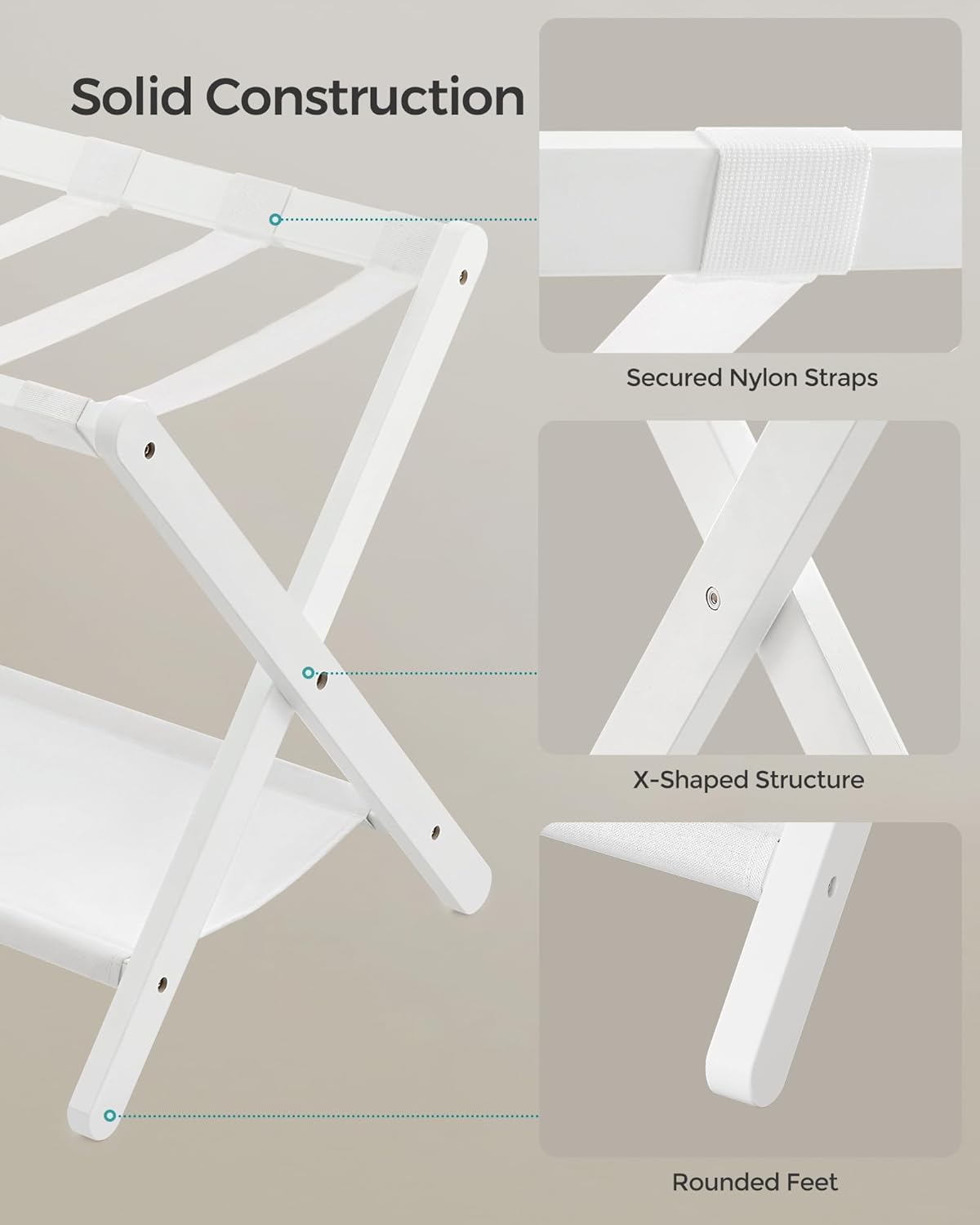 [Sturdy yet Stylish] The natural bamboo frame combined with robust nylon straps supports up to 110 lb on the top and 21 lb on the lower shelf; the classic white finish adds a personal touch to bedrooms, guest rooms, or hotels