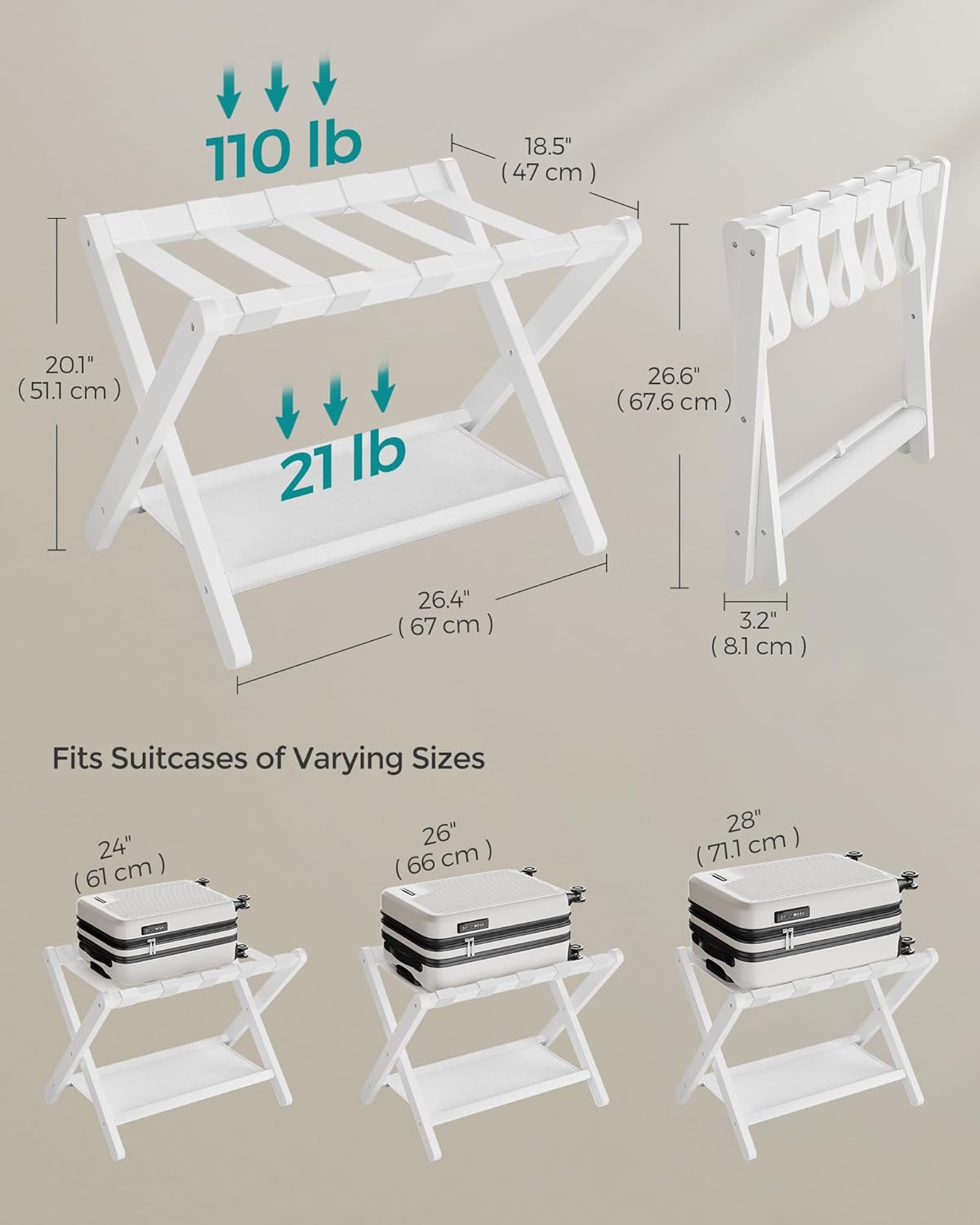 [Wider and Foldable] This 26.4”D x 18.5”W x 20.1”H (67 x 47 x 51.1 cm) luggage rack, that’s wider than similar ones, can hold 24”, 26”, or 28” suitcases. It folds to a 26.4”D x 3.2”W x 26.6”H (67 x 8.1 x 67.6 cm) size for easy storage in closets or corners