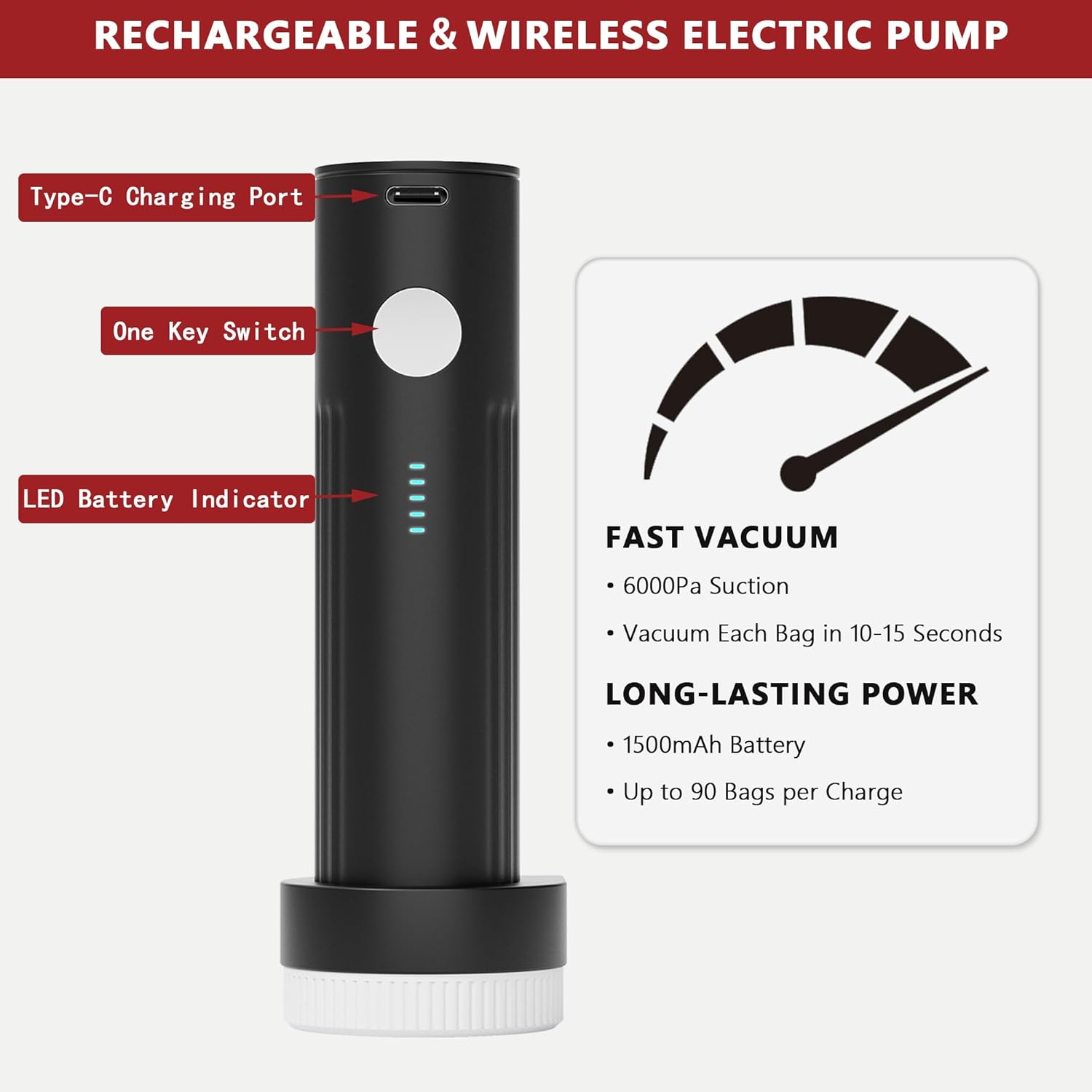 Rechargeable & Wireless Electric Pump: Effortlessly enhance your packing and storage efficiency with our state-of-the-art wireless electric pump. Powered by a 1500mAh battery, it allows you to compress up to 90 bags per charge. With 6000Pa suction, it can compress a bag in 10-15 seconds.