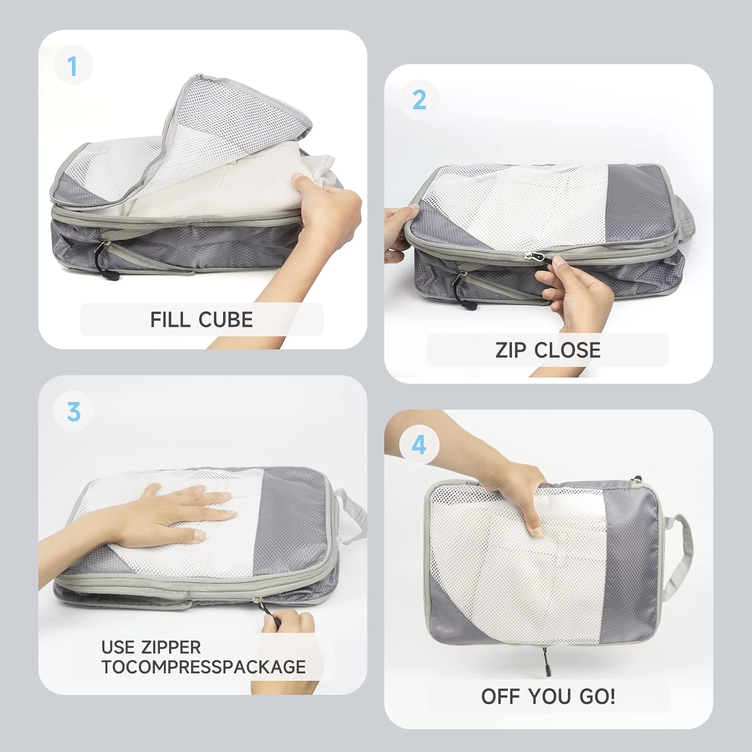 【Packing Cubes with Mesh】 — The compression packing cubes with visible mesh netting, it makes finding what you’re looking for a breeze and no longer have to turn over other travel bags, the breathable netting allows air to circulate, keeping clothing fresh. The zipper of the packing cube is very smooth and put a full zipper to open up and makes it easy to put clothes inside