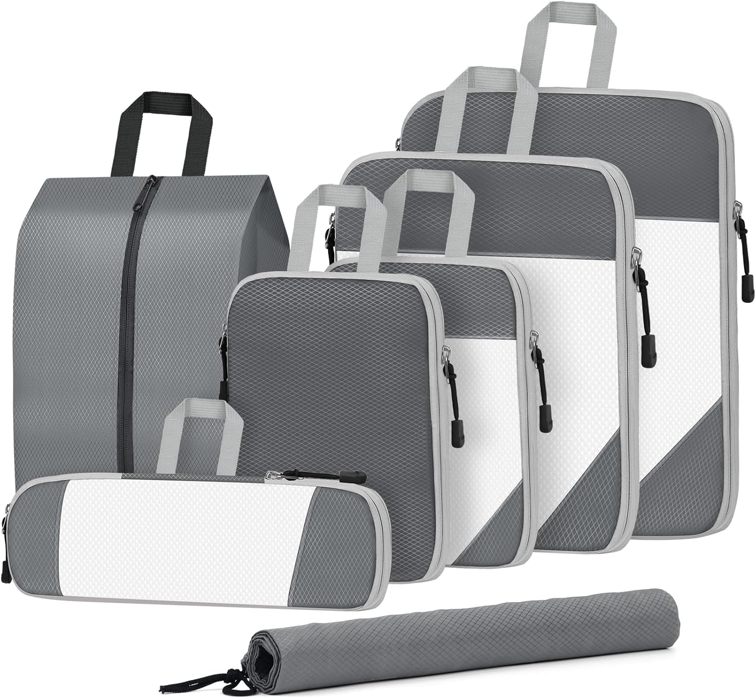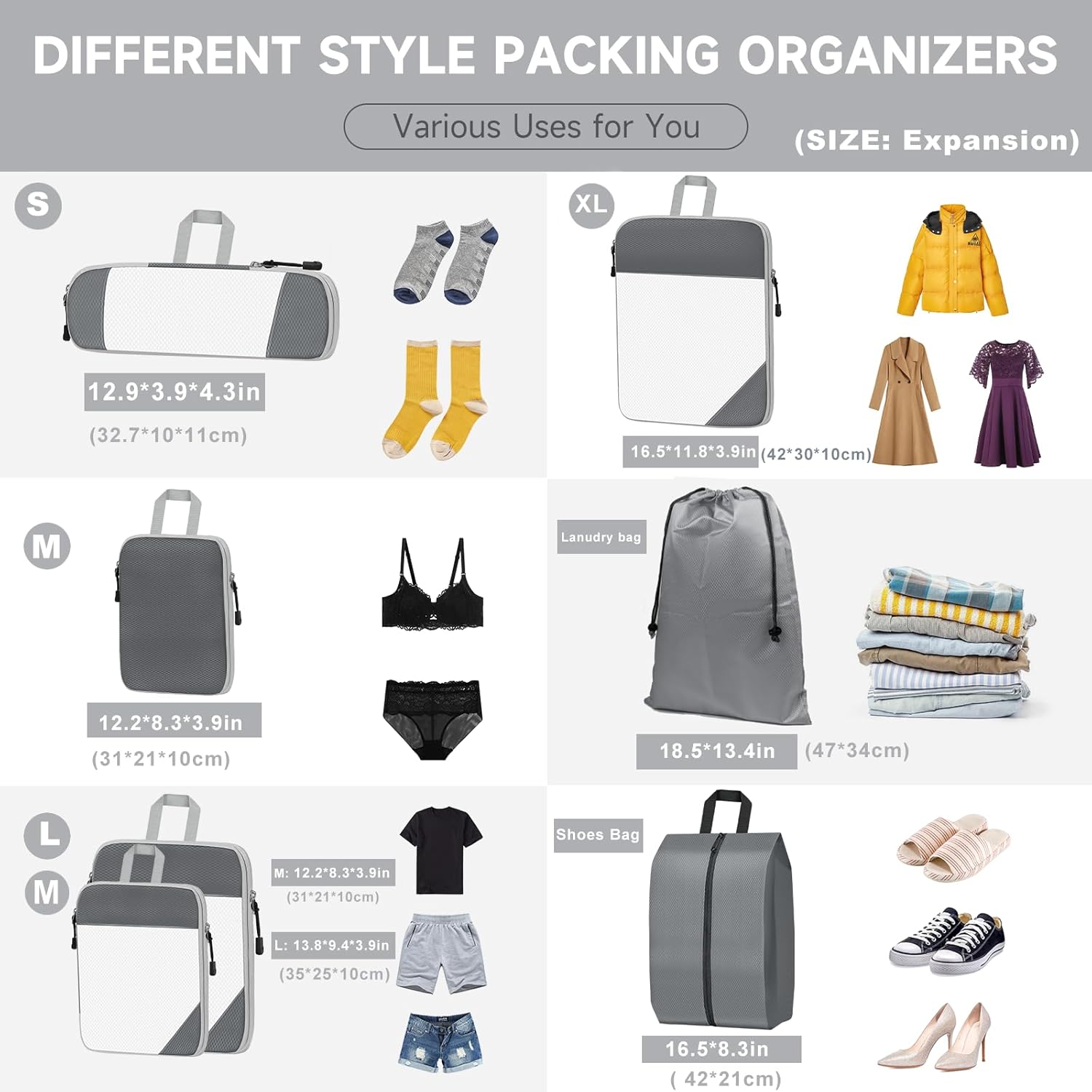 【7 Set Compression Packing Cubes】 — Different sizes packing cubes for carry on luggage for different packing purposes. XL for jackets, sweaters, coat; L for shirts, trousers; M and S for T-shirt and socks. One of the M bag does not have mesh (for underwear PROTECT YOUR PRIVACY). Our compression travel bags also include shoes bag, underwear bag and laundry bag, separate your dirty/wet clothes or shoes