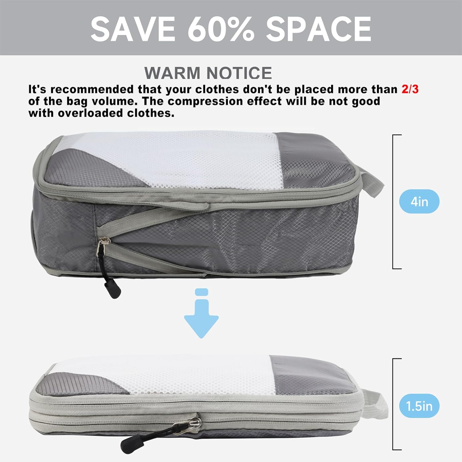 【Compression Packing Cubes Travel Organizer】 — There is a extra zipper outside of our compression packing cubes which can be zipped up to flatten the cubes and saving up to 60% of space. Rolling up your clothes avoids wrinkles and saves more space. Travel organizer cubes are able to pack about 14 days worth of clothes