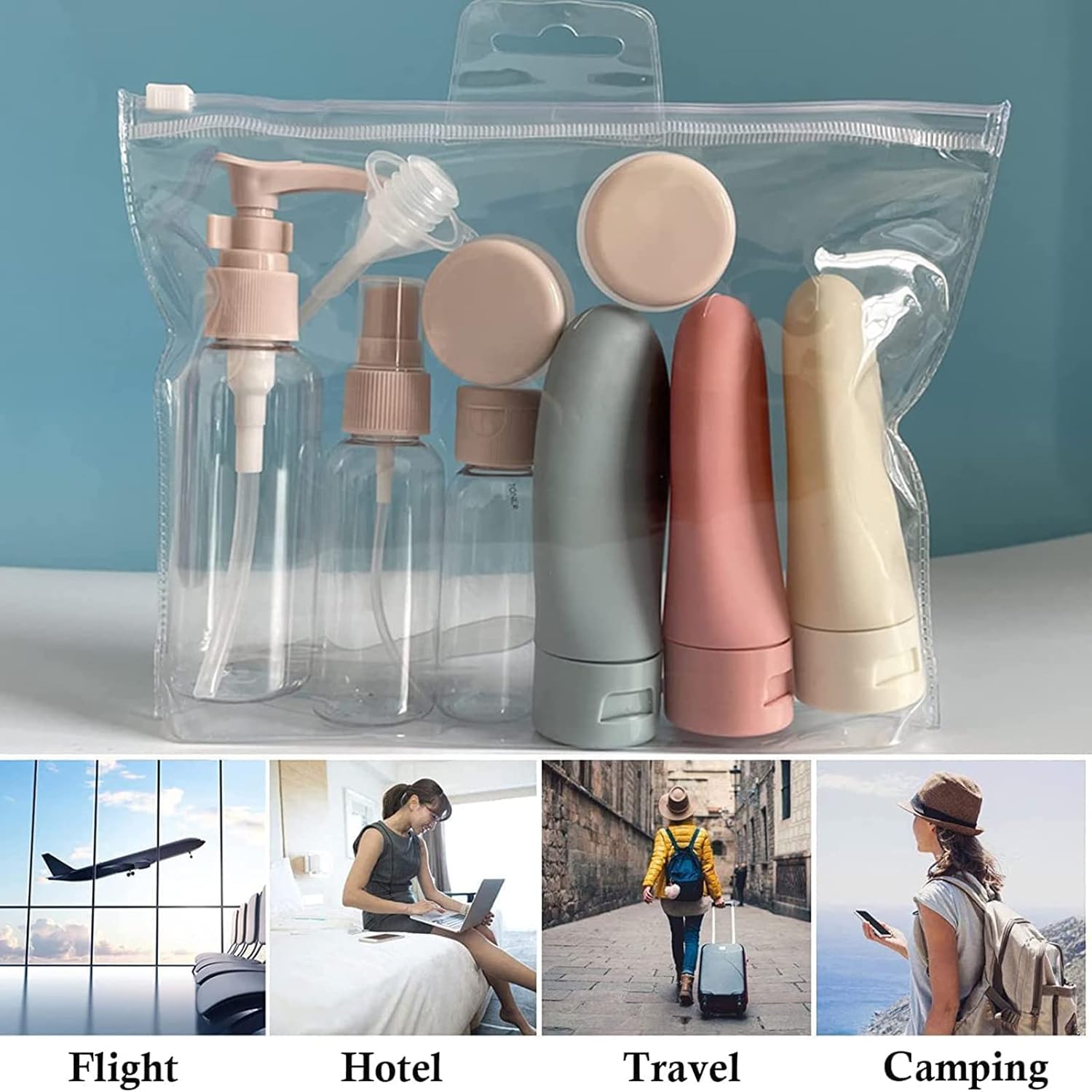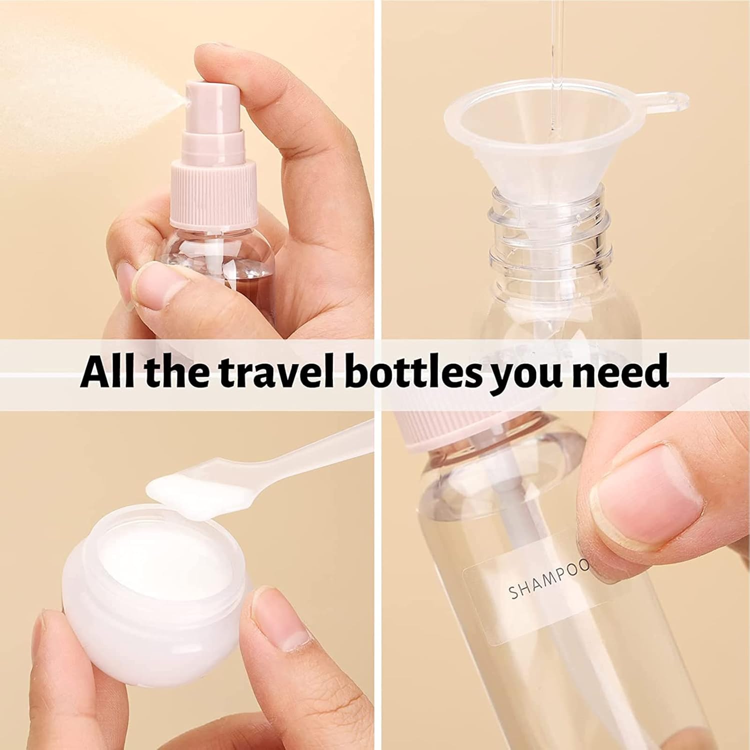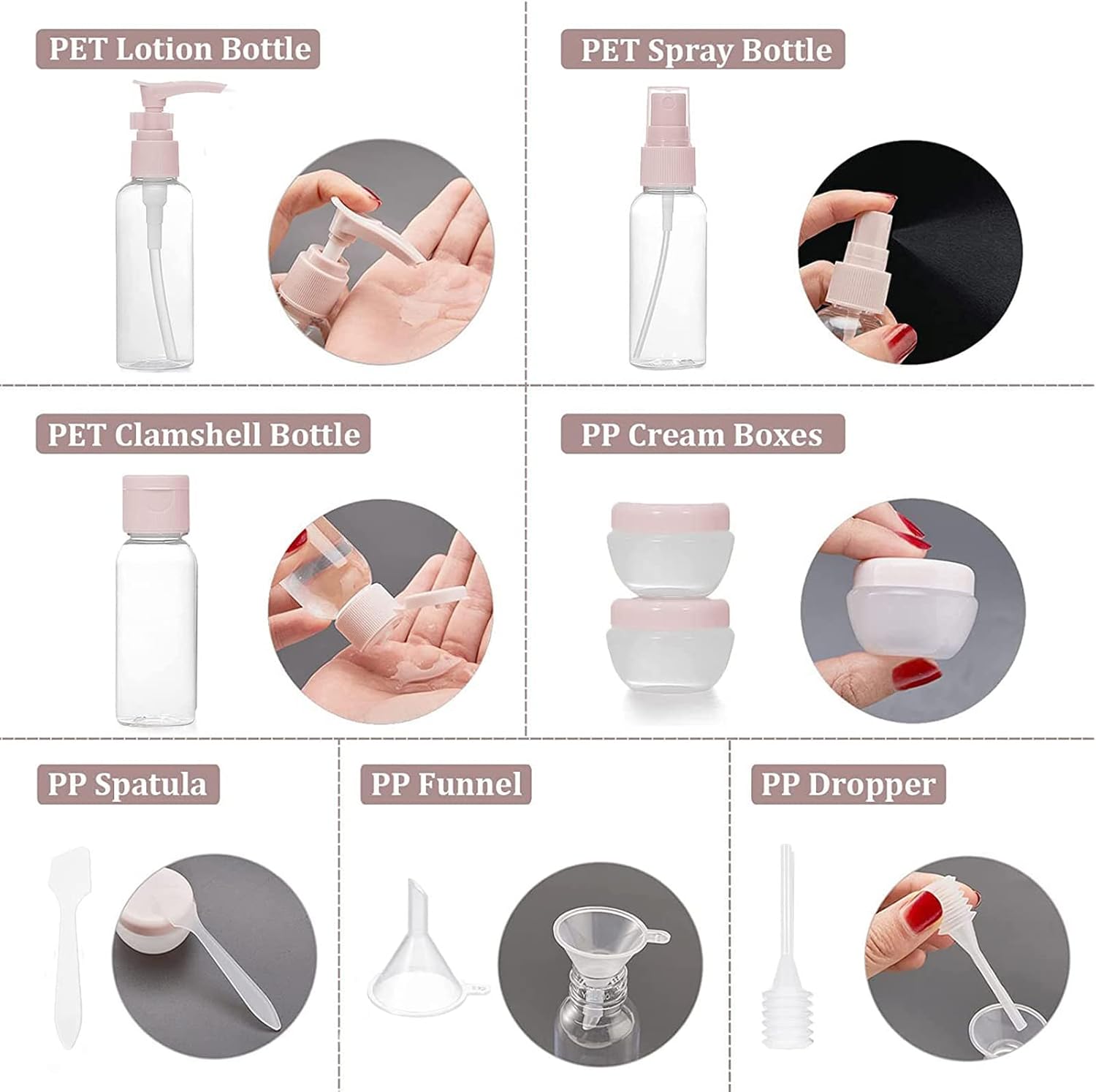 💙[Reusable Travel Bottle Set]: 1 * 80ml pump bottle, 1 * 50ml spray bottle, 1 * 30ml flip bottle, 1 * funnel, 1 * spatula, 1 * pipette, 2 * 10g milk tanks and 3 * 60ml silica gel bottles.They are very light, so you can bring them easily when you travel.